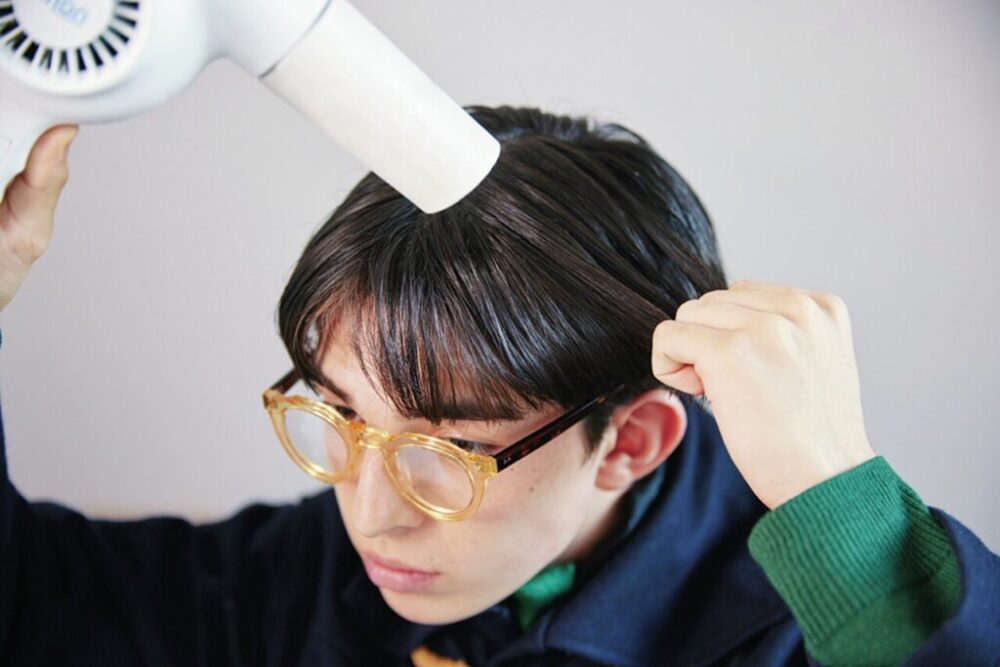 大人の上品さを出すため、髪の表面をドライヤーで押さえて面をしっかり見せてツヤ感を出す。