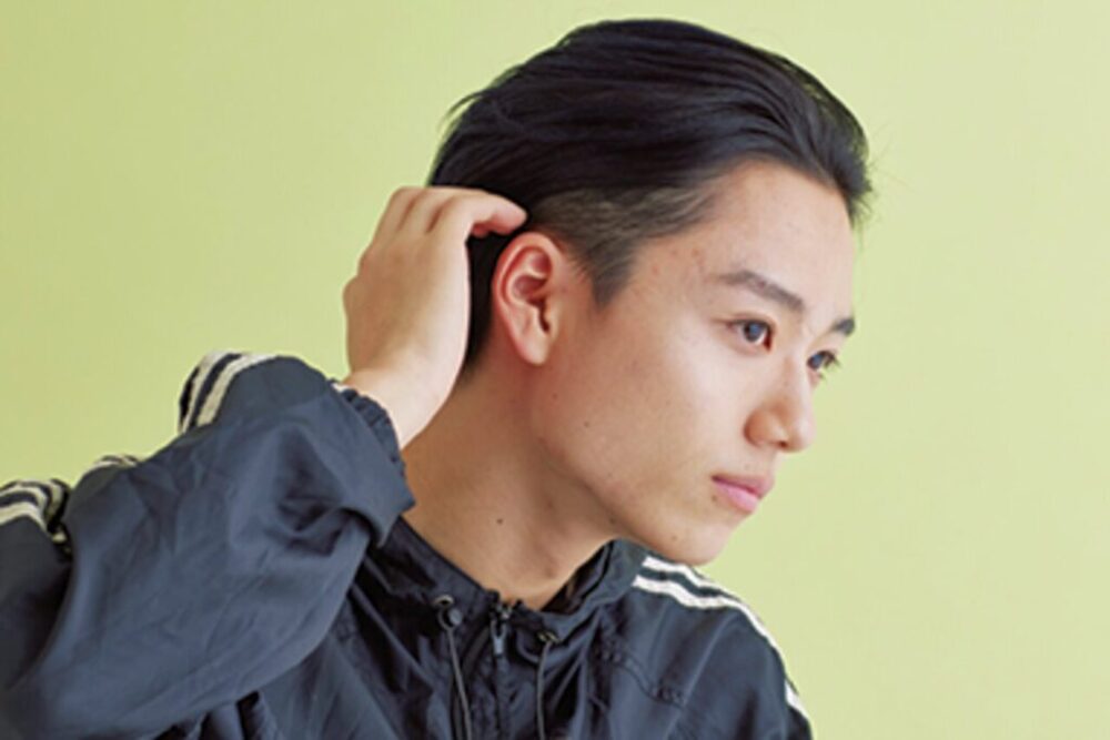 ツーブロックのセンターパート。ワックスとオイルを混ぜ、フロントに塗布して後ろに長し、耳にかける。