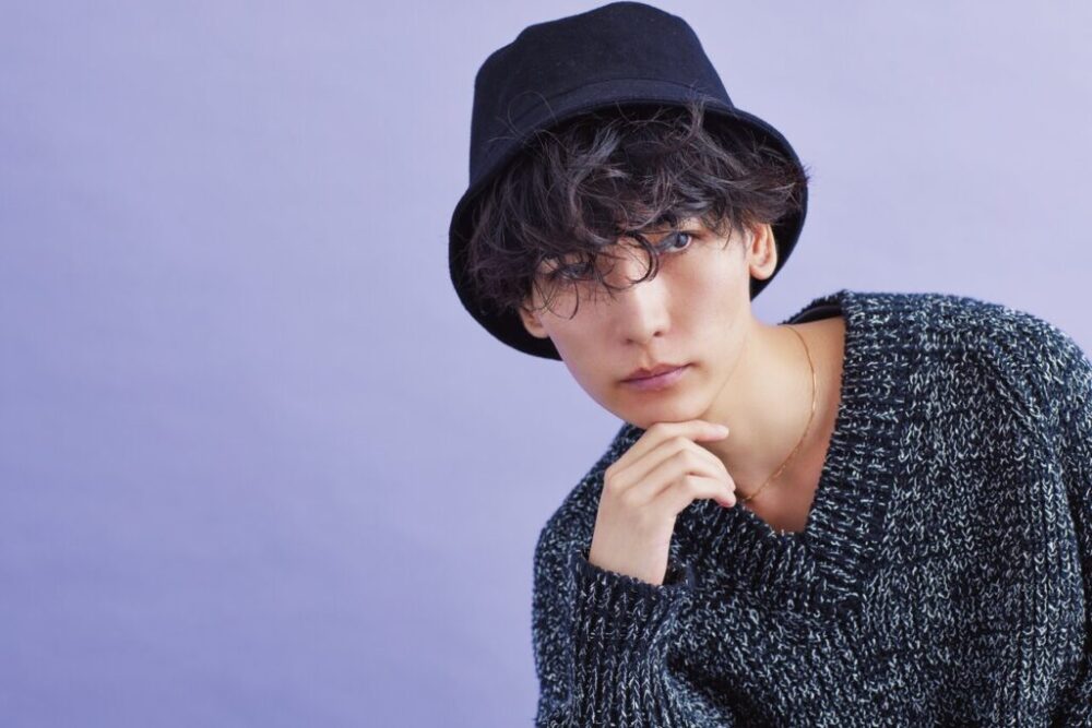 目の下ラインにカットした長めの前髪は、パーマでクシャッとした無造作な動きをプラス。帽子は浅めにかぶって、センターに集めた前髪をしっかり見せるのがポイント。ちょっとミステリアスな雰囲気で、男の色気を感じさせてくれる。