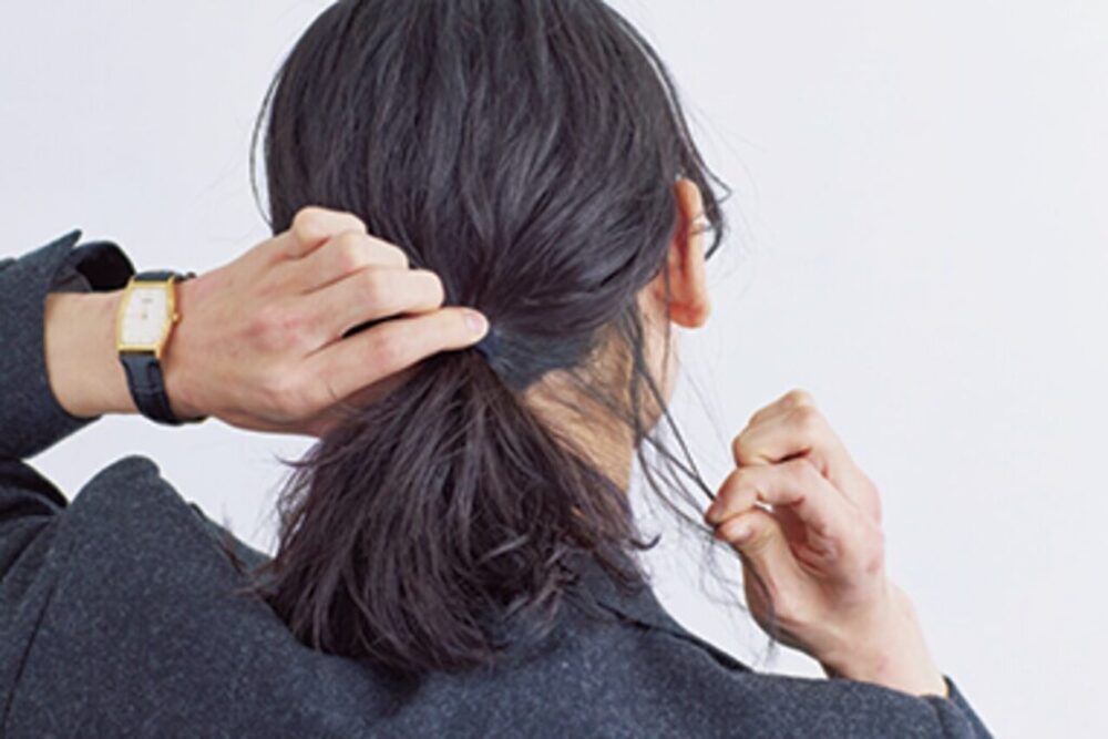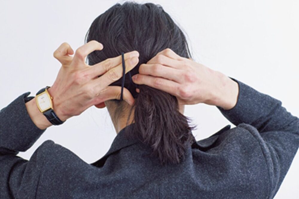 バームとジェルを混ぜ、手グシを通して全体に薄くなじませる。ザックリひとつにまとめ、後れ毛を出す。 使用スタイリング剤:ヘアバーム/レタッチ、Uハードジェル/キュー