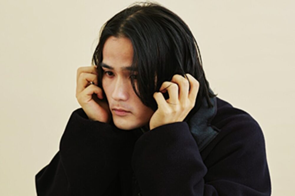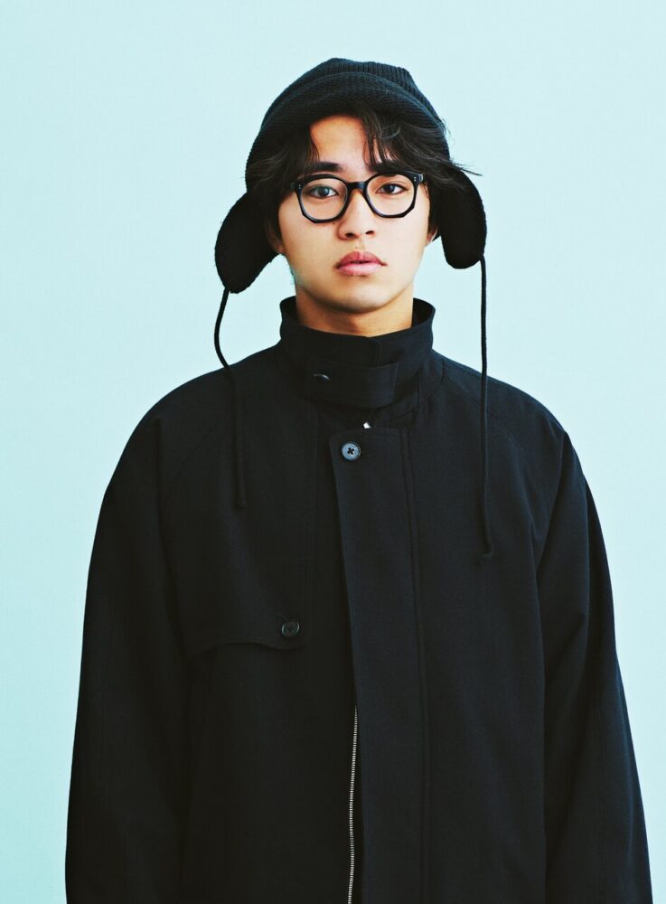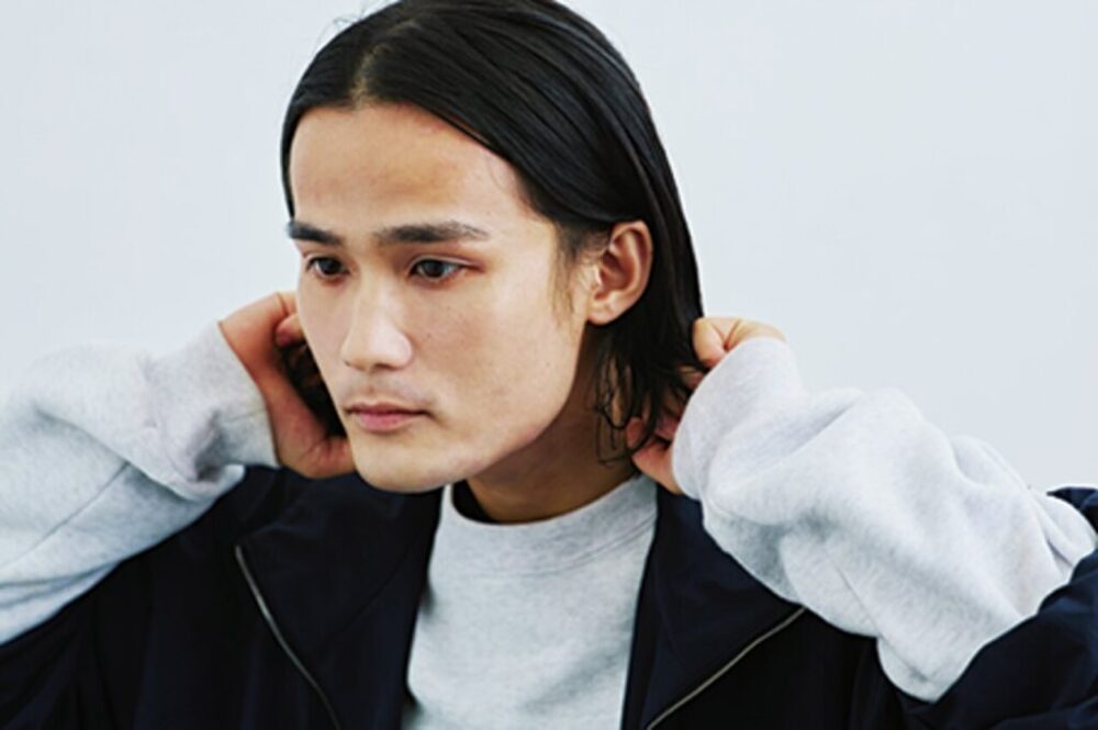 前髪が勝負の要。モードすぎるのもおもしろくないので、前髪のスタイリングで遊んで、クールだけどカジュアルなストリート寄りに。6:4ぐらいにパート分けして毛先にハネ感をつける。センターパートだとトレンドど真ん中なので、あえてはずしにいくとちょっと差がつくのでオススメ。毛束を出しながらちょっとだけドライな質感にするとハズしができていい感じ。