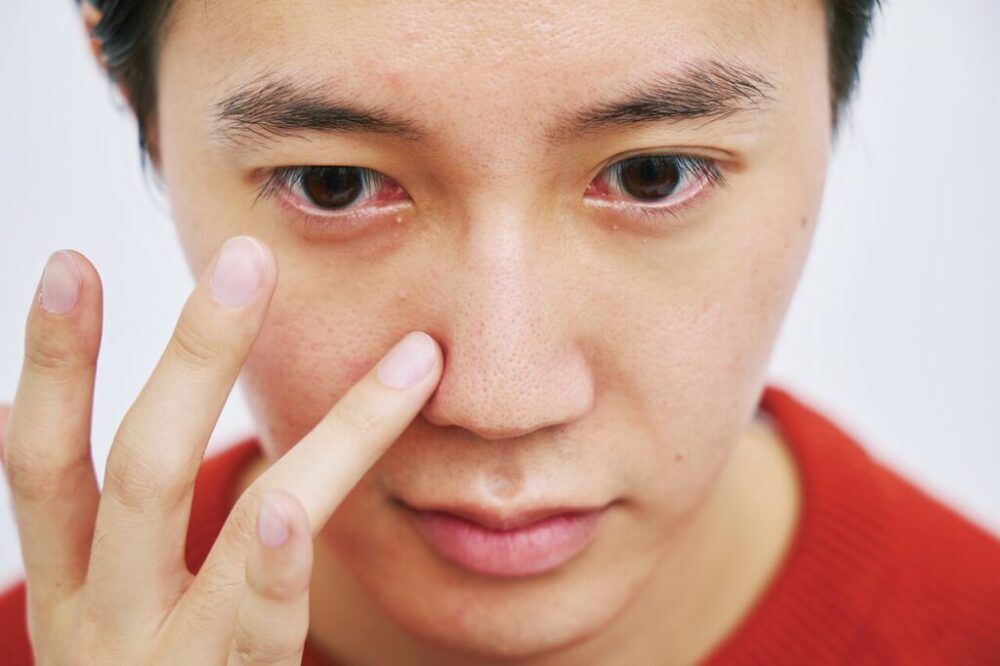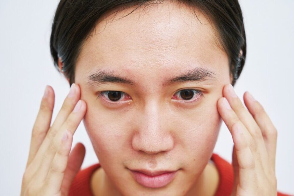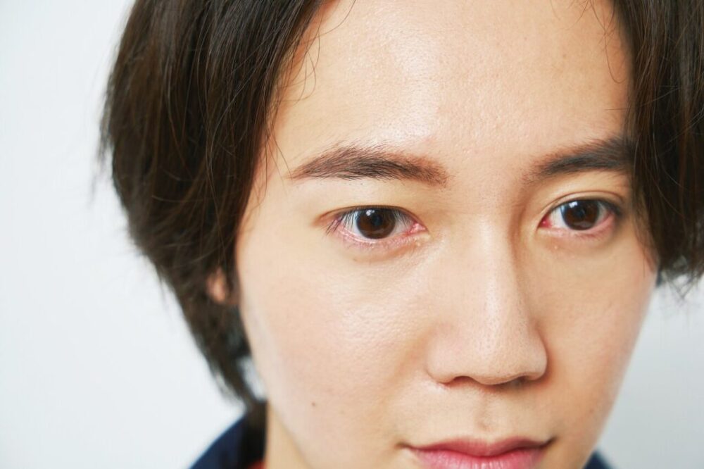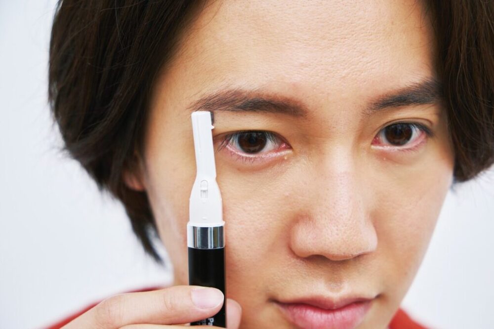 続いてシェーバーでまぶたの毛を剃る。この時、毛流れに逆らうように眉尻から動かす。逆剃りにするときれいに処理できる。