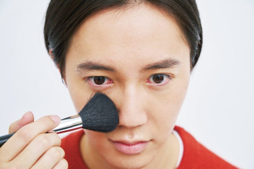 【肌質】典型的な混合肌タイプ。おでこ、鼻、あごのTゾーンは脂っぽい。一方で頬はけっこう乾燥しているのが悩み。今回の「肌づくり」のポイントは、とにかく、テカらせない! 脂っぽさが気になる小鼻周辺の皮脂をケア。そして毛穴や赤みをカバーするコントロールカラーで肌補正。パウダーで皮脂が出てくるのを防ぐ対策を施していく。