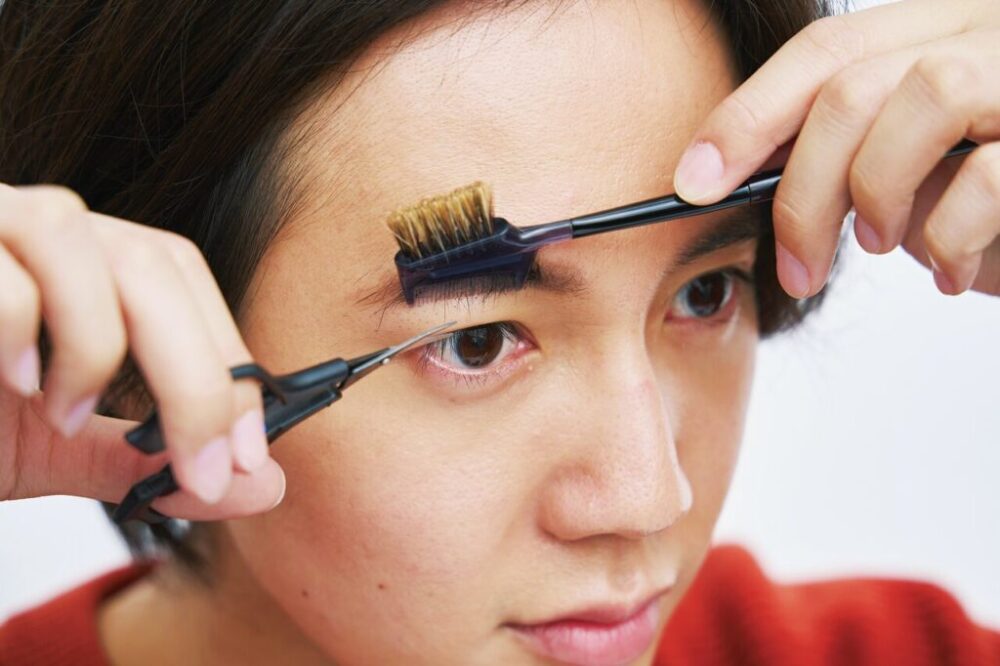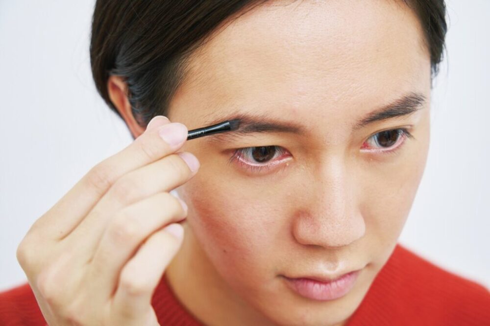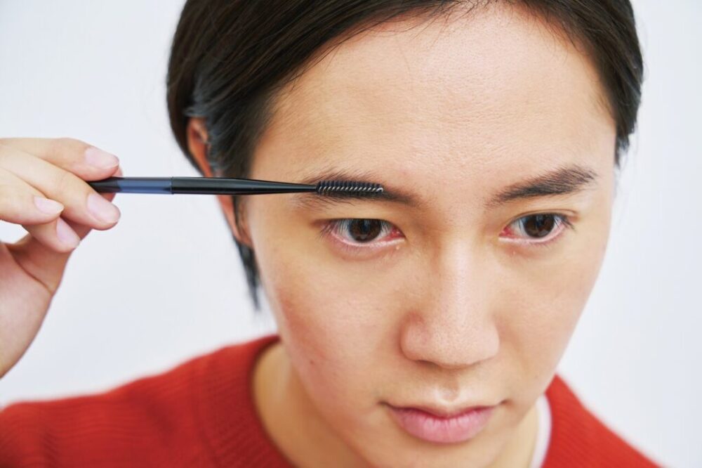 眉メイクと眉カットはどちらから始めてもいいが、先に眉を描いておくと手入れをする目安がわかりやすい場合も。今回は先に眉メイクを行っていく。