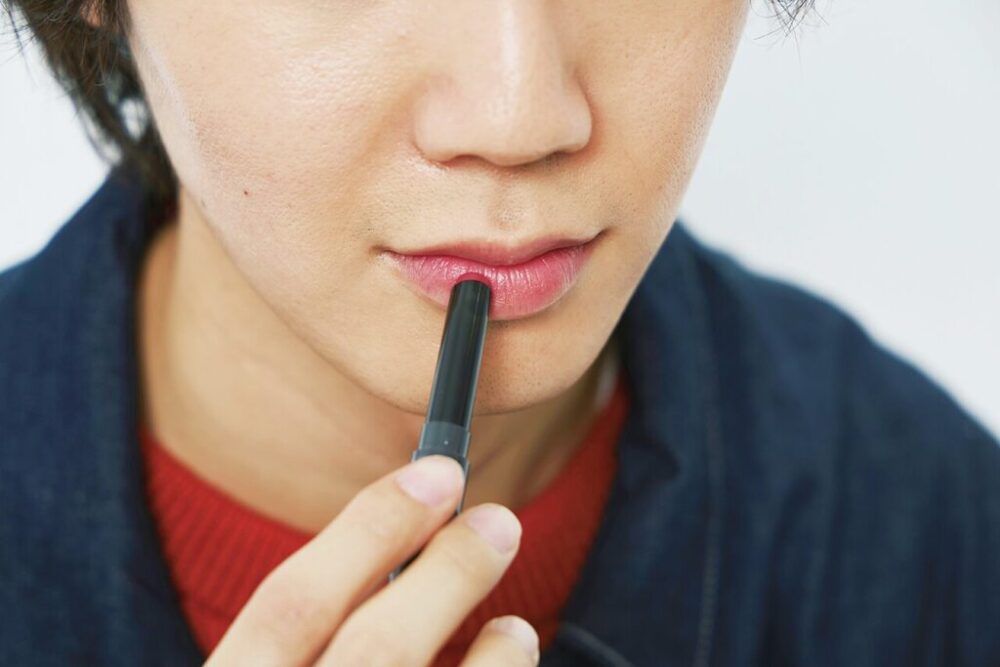 直塗りでOK。くすみ系のレッドカラーは使いやすく、あると便利な1本。ギャツビー ザ デザイナー リップ&アイカラーリングスティック スモーキーレッド ¥1,760/マンダム
