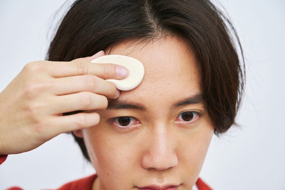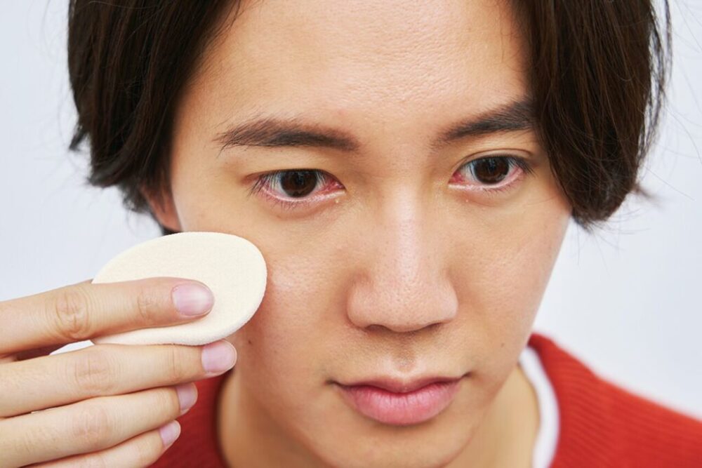 スポンジを挟むように持ち、テカリ部分をトントンと。余分な脂を押さえてなじみよく。