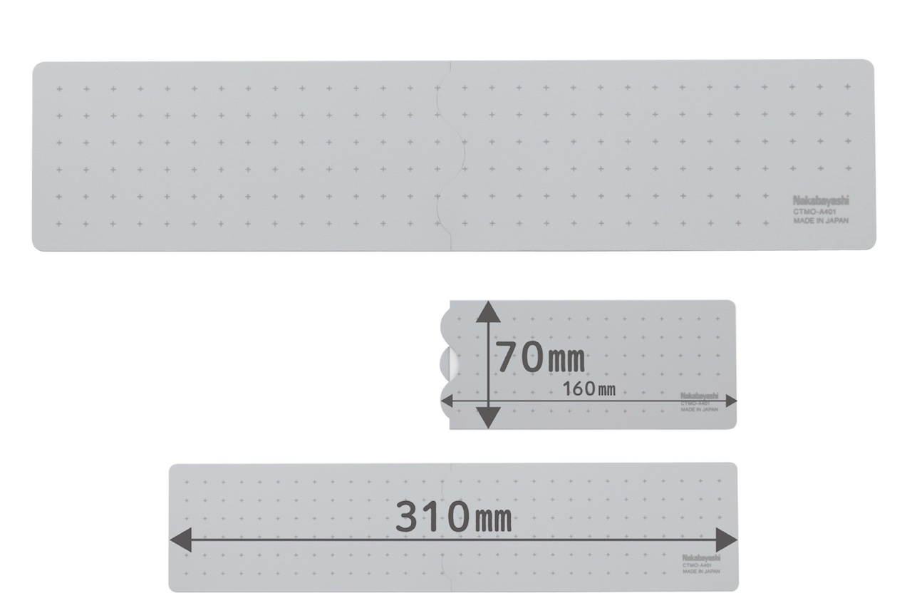 「モバイルカッティングマット」は本体を半分に折りたたむことでコンパクトに持ち運べるカッティングマット。開いた時は、A4用紙(297×210mm)までのカッティング作業にちょうどよい【ヨコ310mm×タテ70mmサイズ】、折りたたみ時は半分の【ヨコ160×タテ70mmサイズ】になり、筆記用具やカッターナイフと一緒にペンケースへ収納、持ち運ぶことができる。