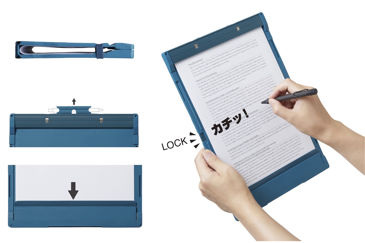 本体を半分に折りたたみ、ゴムバンドで固定できるため、A4サイズが入らないカバンにも収納できる。また、ボードを開くと自動で筆記面がフラットになり固定されるため、開いた状態で筆記ができるのが特長。