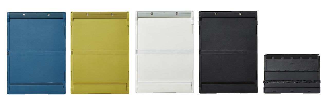 本体は内側に折りたたむ構造で、書類の中身を見せずに収納することができ、カバンの中で書類を汚れなどから保護する。収納枚数は約15枚で、折り目を付けずに大事な書類もキレイに収納できる。本体に収納可能なペンホルダーも付いており、ペンと一緒に持ち運ぶことが可能に。工事現場、医療・介護現場、展示会・街頭アンケートなどで活躍します。カラーはアオ、キイロ、シロ、クロの4色展開てとなっている。