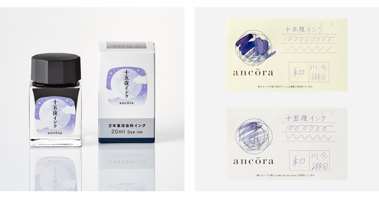 アンコーラ銀座本店で人気の、“雨の日”にだけ店頭に並ぶ「雨ふりインク」に続く、銀座本店限定のインク企画。新たに発売するのは、満月の日から3日間のみ販売する「十五夜インク」だ。