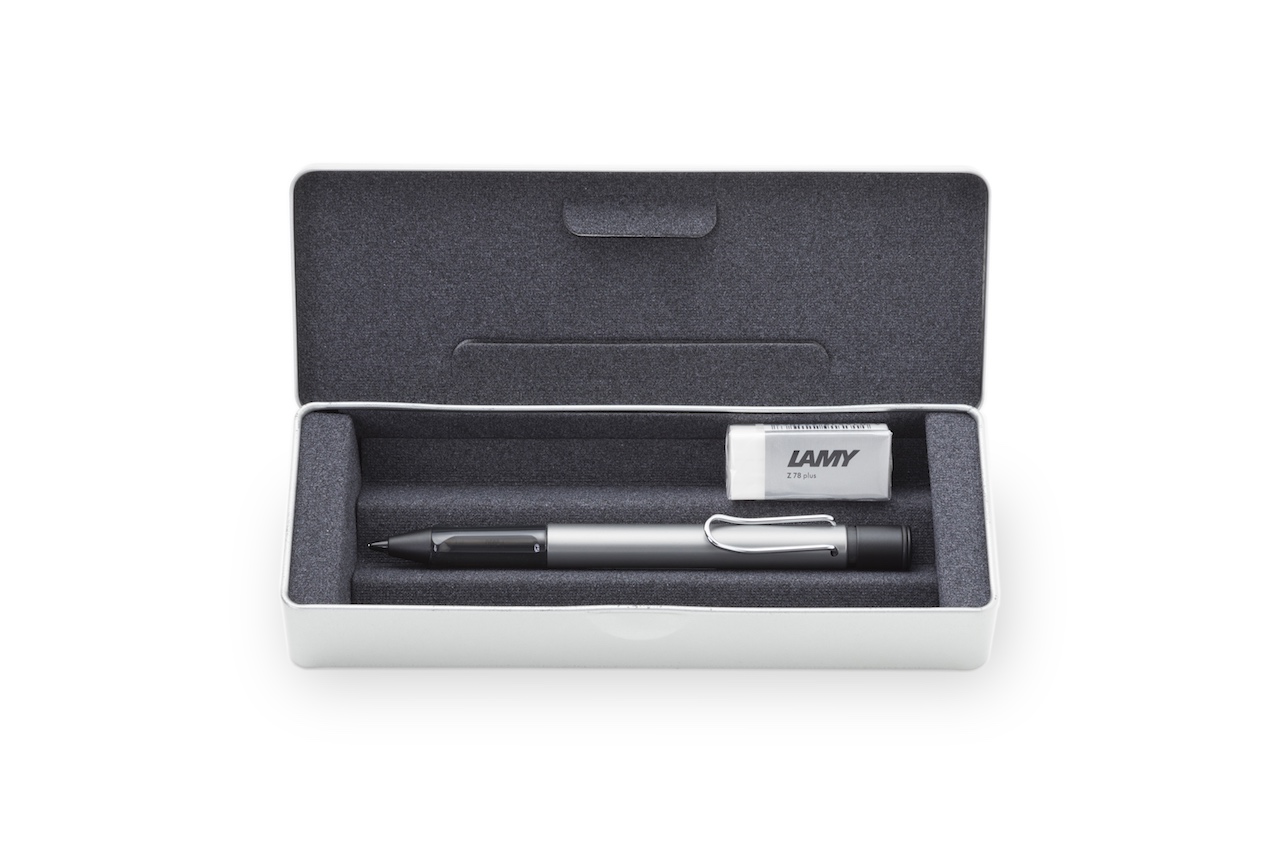 この度入荷するラミーアルスターの2色は、今後定番商品として販売されるが、今回の発売を記念して数量限定でラミーオリジナル缶ケースとイレーサーが付属する。