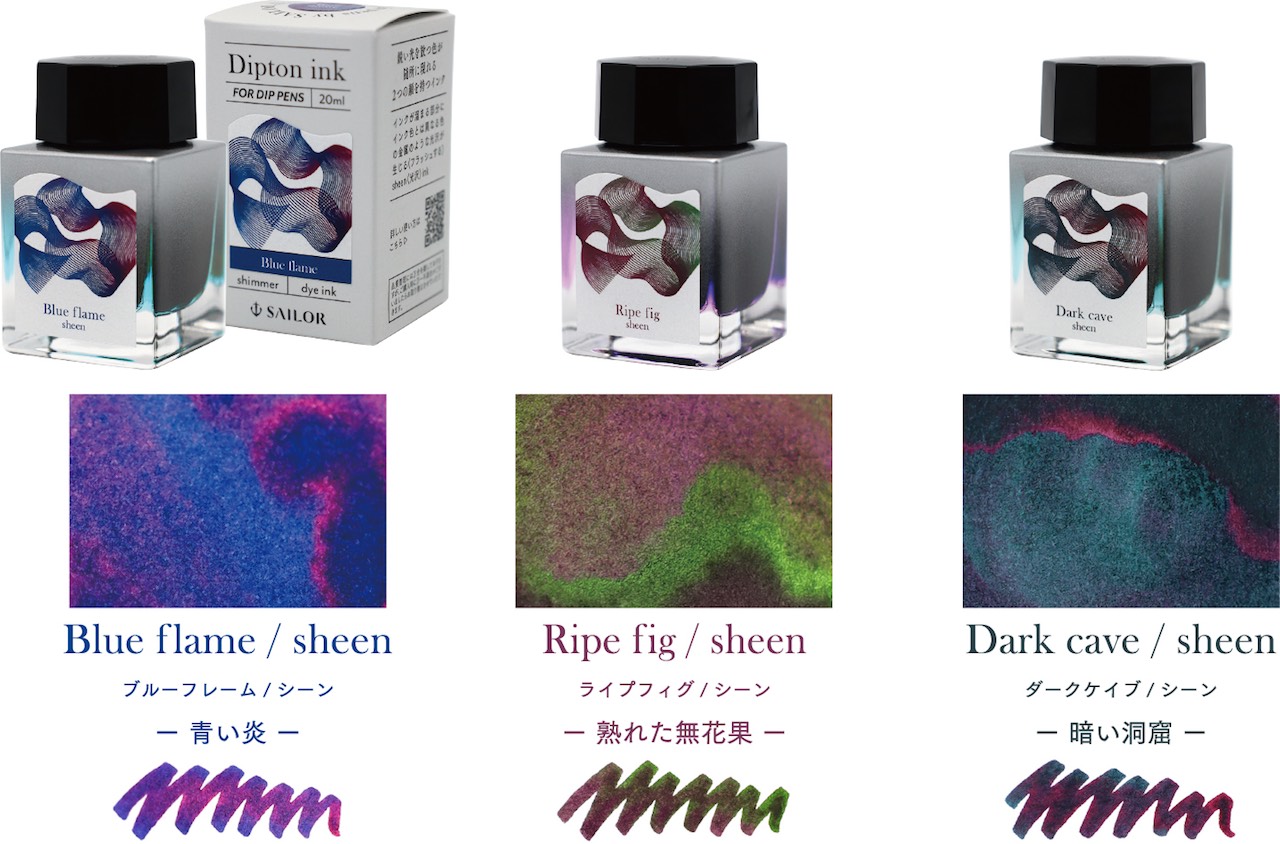 鋭い光を放つ色が随所に現れる2つの顔を持つインク。つけペン用だからこそ広がる多種多様なインクの魅力を感じルことができる。深いインク色とその色彩とはかけ離れた色の光沢が醸し出すダークな世界観をテーマとした全3色。幅広いインクの魅力を発信していく。