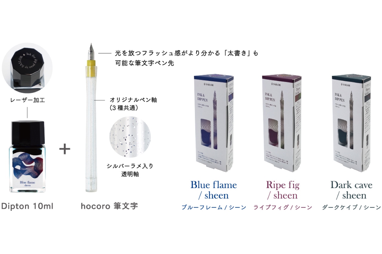 「万年筆ペン先のつけペン hocoro」シリーズの発売以来、つけペンブームが到来。手軽にいろいろなインクを楽しめるつけペンの存在は、より身近なものになった。2023年7月に登場した偏光ラメ入りのshimmer〈きらめき〉inkにつづき、インクが溜まる部分にインク色とは異なる色の金属のような光沢が生じる(フラッシュする)sheen〈光沢〉ink が発売になる。