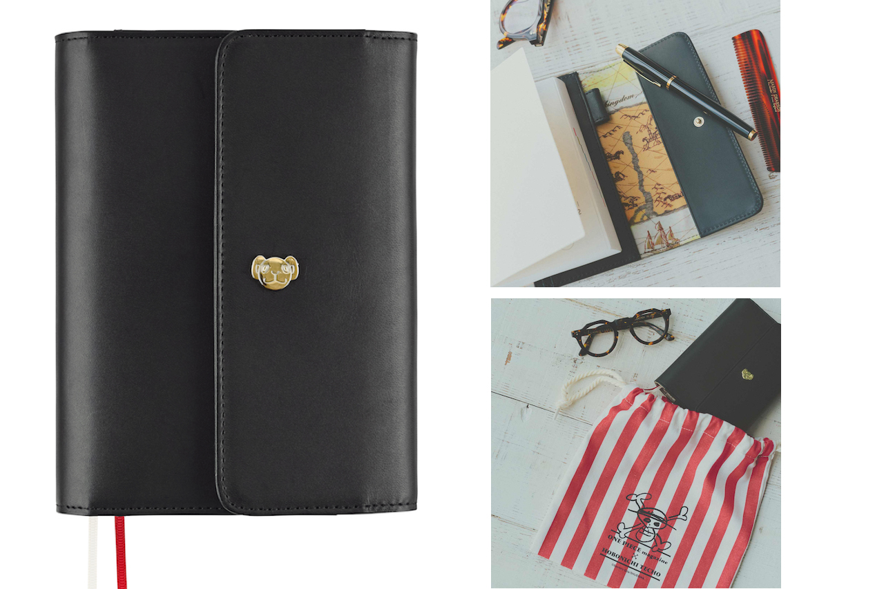 ゴーイング・メリー号をモチーフに作ったカバー。手触りのなめらかなブラックの本革を使い、手帳本体をくるりと包むデザインの3つ折りカバー。メリー号の顔をかたどった金色のボタンがついている。内側の布部分には海図がプリントされ、ログブックの雰囲気もたっぷり。