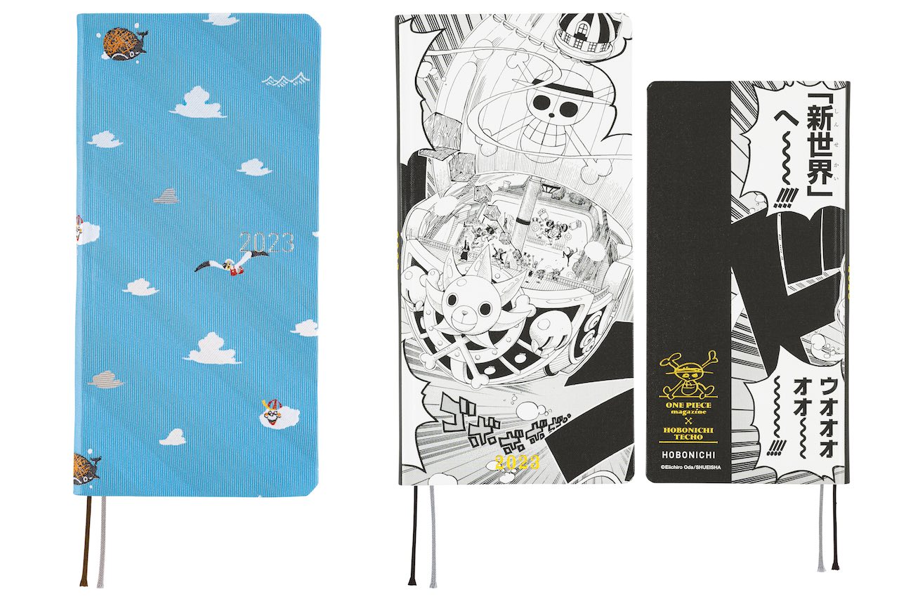 weeks(週間手帳)からも、2つのデザインが誕生。「GRAND LINE」(左)は、麦わらの一味がたどった航路をモチーフにしたもの。あざやかな水色の地を空と海に見立て、航路で出会うキャラクターたちを散りばめている。「新世界へ!」(右)は、サウザンド・サニー号に乗った麦わらの一味が新世界へいざ出航するという躍動感にあふれた名シーンをデザインしたもの。ルフィのセリフ「『新世界』へ~~!!!!」の文字が裏面に大きく入っている。