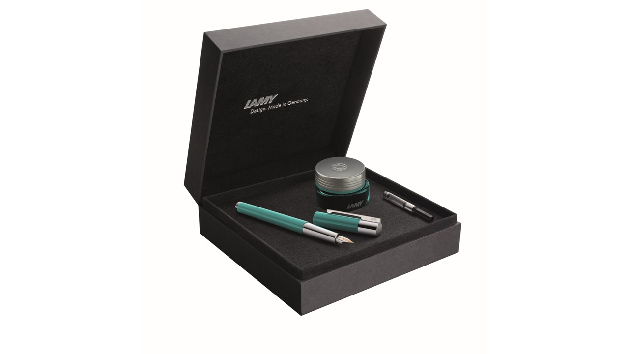 2023年は、持つ者を魅了するエモーショナルな魅力の詰まったスカラに、透明感のある翡翠をイメージ したカラーが登場。今季は、アマゾナイトカラーのクリスタルインク、コンバーター、ブラックとブルーブラックの5本入りカートリッジインクを専用ボックスに組み込み、特別なセットにして発売する。世界1,500セット限定、クリップ側面にシリアルナンバー入りだ。