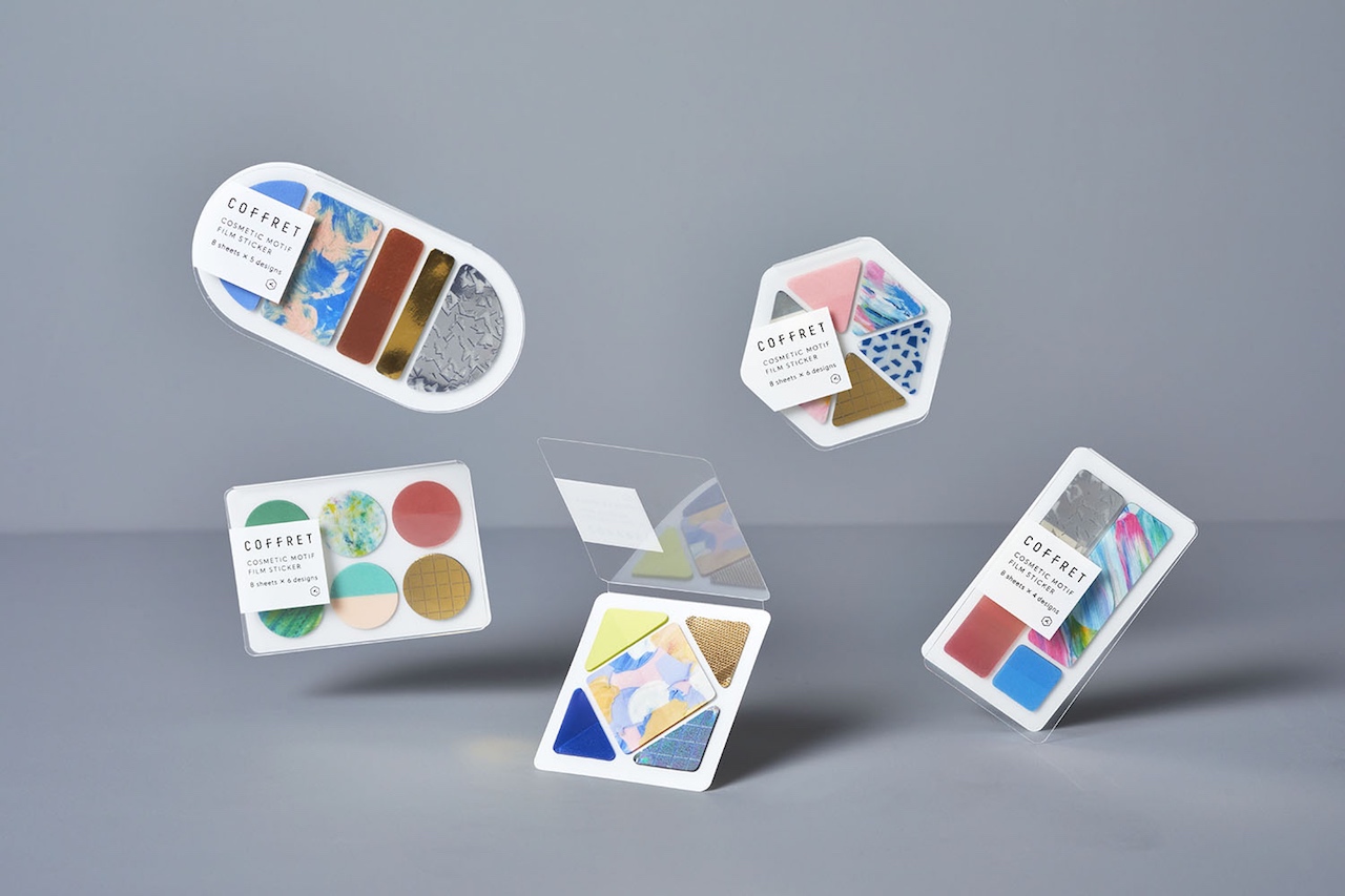 「コフレ」は、コスメパレットをモチーフにした、貼ってはがせるフィルムシール。季節や気分に合わせてコスメを楽しむ感覚で、シールでも自分らしく自由な彩りを楽しんでほしいという想いから企画されたもの。