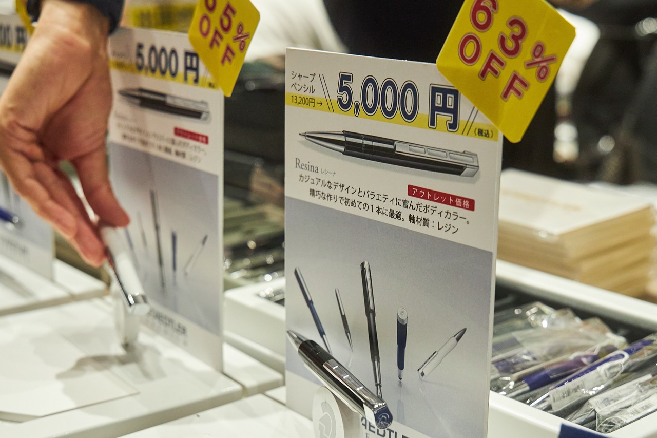 アウトレット品も販売。普段は手の届かないものが入手できる絶好の機会だ。ステッドラーの「レシーナ」シャープペンシルは通常価格税込13,200円のところ、63%オフの税込5,000円! 破格の値段に手に取る人が絶えなかった。