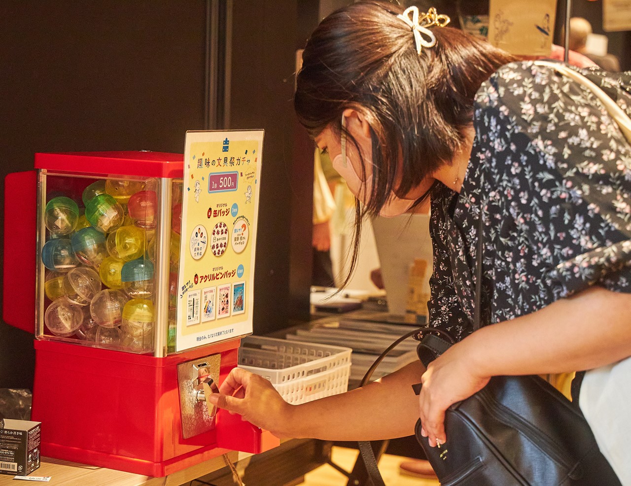趣味の文具祭ガチャでは、3種類の缶バッチと4種類のアクリルピンバッジも用意。缶バッジには星野 桂さんの筆欲の神のイラスト、アクリルピンバッジには趣味の文具箱の表紙などが描かれた。ちいさくてかわいいピンバッジは編集部員も思わず欲しくなる出来だった。