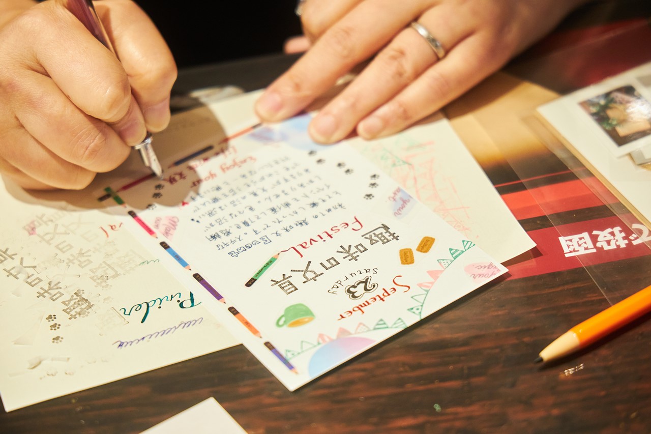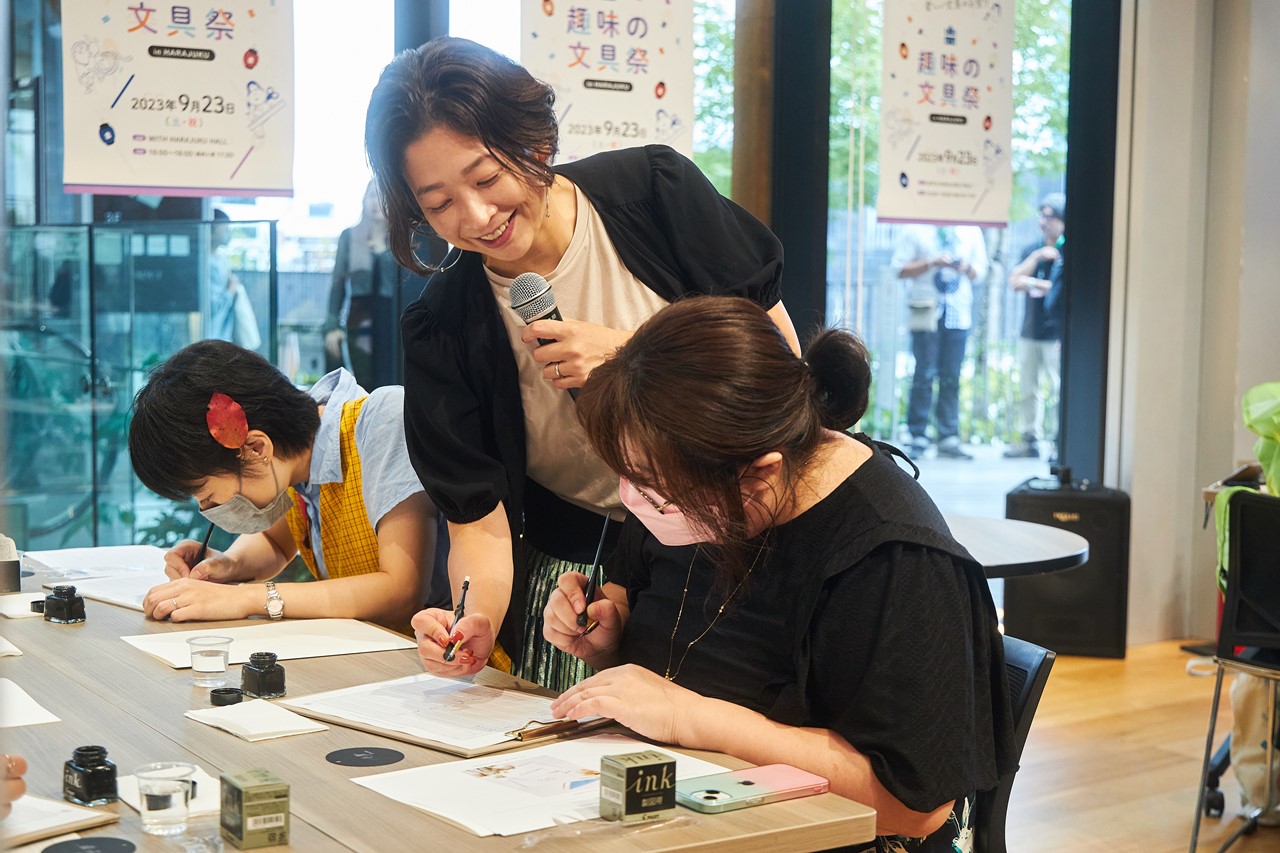「モダンカリグラフィー」の第一人者として知られる島野真希さんによるワークショップ。島野さんのカリグラフィー教室は普段予約が取れないほどの人気。初めてカリグラフィーペンを体験する方もいて、貴重な体験ができる機会になった。