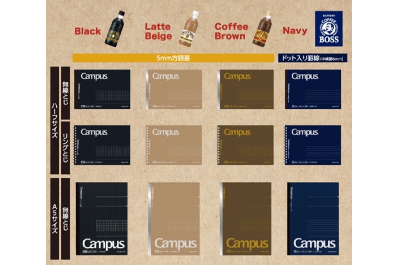 「BOSS」ブランドのイメージカラーのネイビーに加え、「クラフトボス」のブラック、ラテ、微糖、それぞれの味覚をイメージした4色を表紙カラーに採用。ネイビーとブラックは定番、ラテベージュとコーヒーブラウンは限定カラーとなる。
