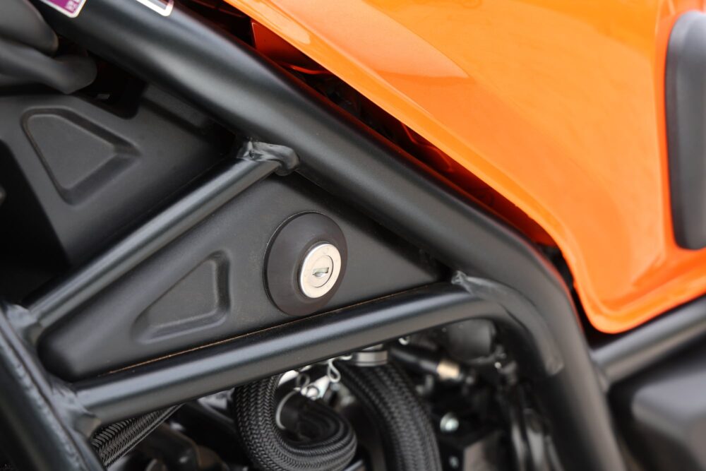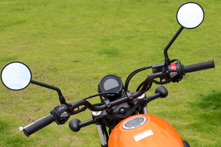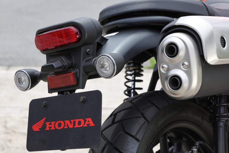 このCLだと、たとえばサスペンションのストローク量はフロントが150㎜、リヤのアクスルトラベルは145㎜。ハンドルの幅は広く設計され立ち乗りもサマになりやすく、フラットなダートや林道くらいなら何のその。最低地上高は165㎜あり、多少の段差や軽いガレ場なら臆することなく進めるだろう。都会的な雰囲気をまといつつ、“ちょいワイルド”なところも、好きな人にはたまらないバイクなのだ。