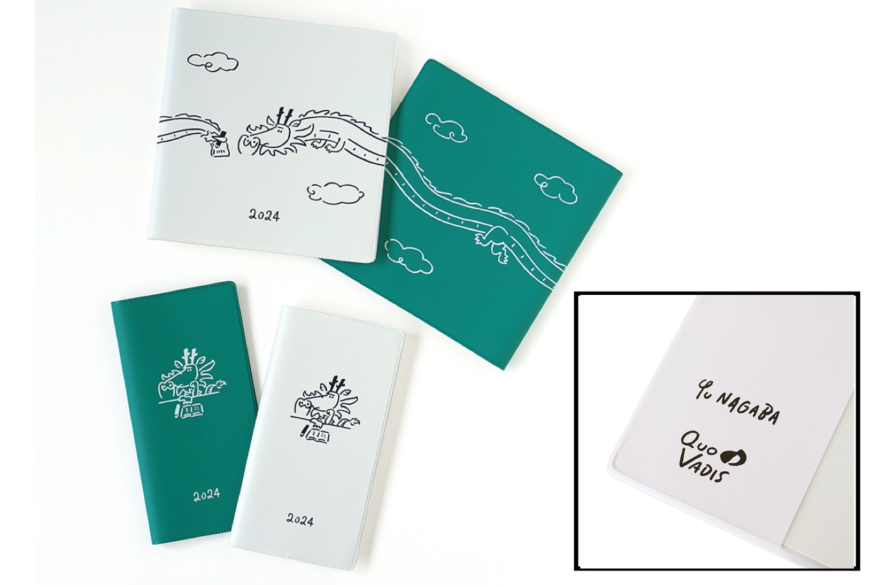 毎年人気のコラボレーションダイアリーで、第6弾となる今年は干支の「辰」をモチーフにした新作が登場。ダイアリーのフォーマットはクオバディスのユニークな正方形サイズのマンスリーダイアリー「カレプラン」と、スリムサイズの薄型マンスリーダイアリー「ビソプラン」の2種類となっている。