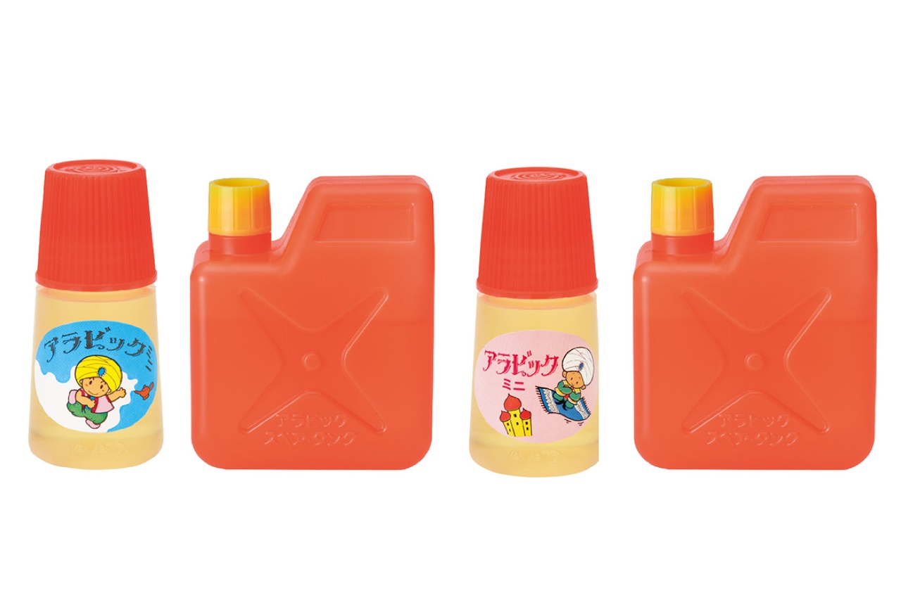 アラビア風の愛らしいキャラクターがデザインされている「アラビックミニ」に加え、灯油の容器でおなじみのミニチュア化したかわいいポリタンク(「スペア・タンク」)には、補充用の液状のりが入っており、昭和の世界観を味わいながら補充作業も楽しめるセットになっている。