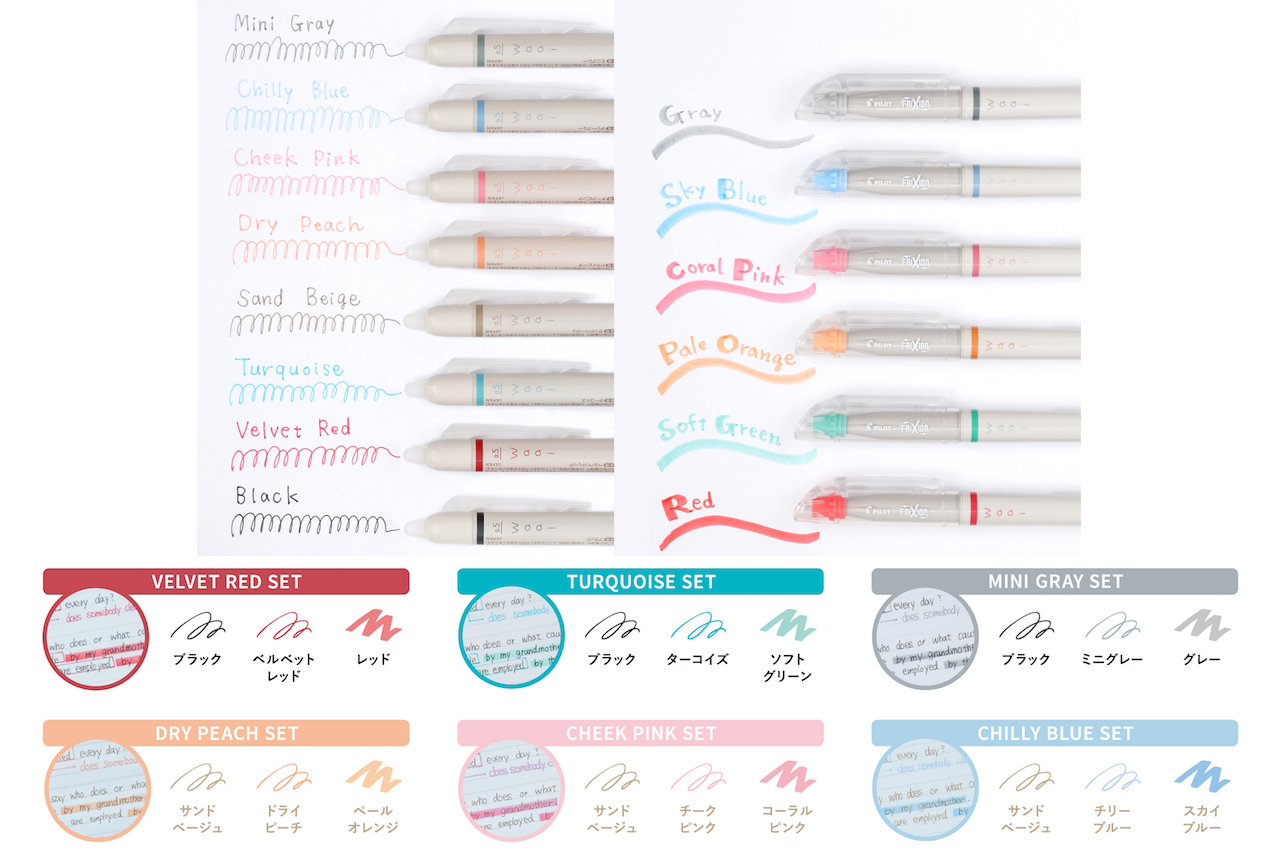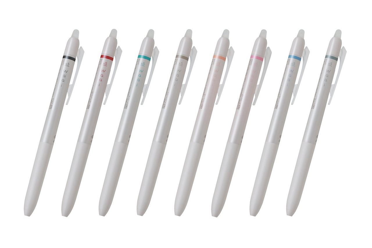 インキ色は定番の黒と“おしゃれにひとくせ。”をコンセプトにした新色の7色を加えた計8色で展開する。新色は日常使いしやすく、アクセントカラーにもなるため、垢抜けた印象の紙面を簡単に作ることができる。また、大学構内やカフェなどの外出先でも消しカスが出ないため、机を汚すこともない。