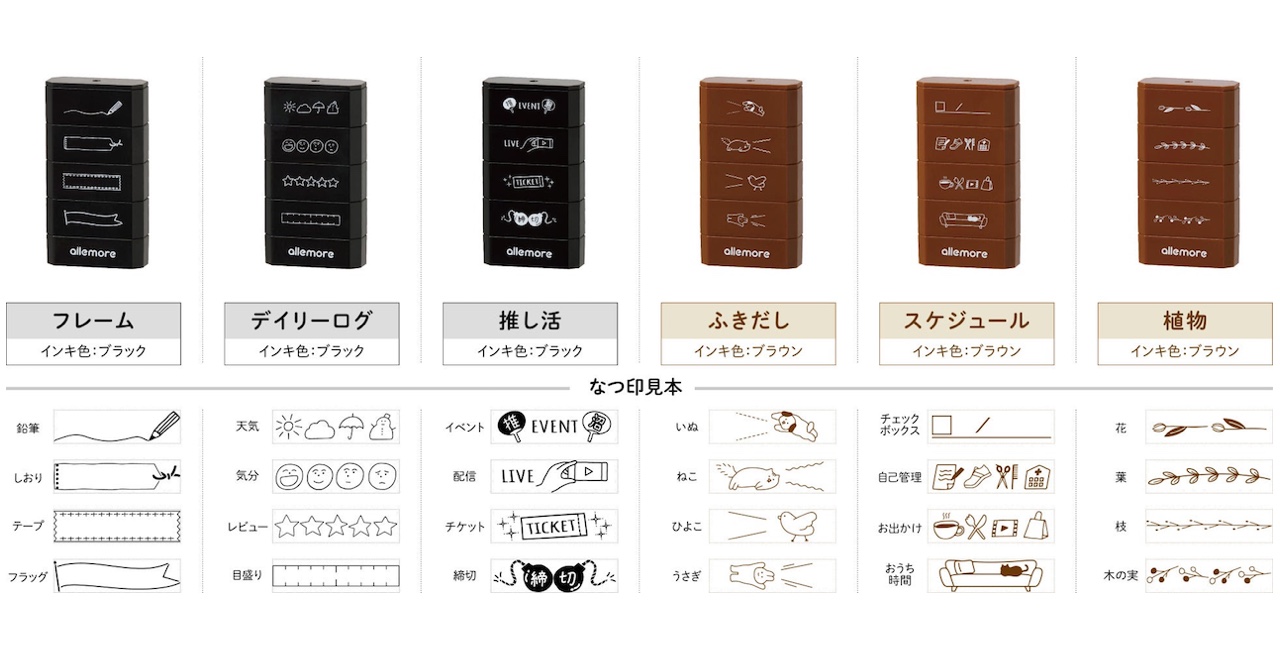 4つの異なる絵柄のスタンプがひとつになったコンパクトなスタンプで、手軽に持ち歩くことができ、いつでもどこでも自分好みの手帳やノートを作成することが可能だ。フレームやデイリーログ、スケジュールなど普段使いしやすい絵柄はもちろん、「EVENT」や「LIVE」などの文字が可愛くデザインされた推し活に最適な絵柄など、6種の連結スタンプをラインアップしている。