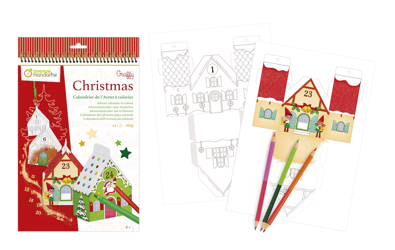 「GRAFFY CHRISTMAS 立体ぬりえパッド」は、アドベントカレンダーをつくることができる「ぬりえ」パッド。1~24の数字が入ったかわいいデザインのぬりえが24枚綴り。色鉛筆やマーカーで色を塗った後、組み立てると手のひらサイズのおうち型ボックスが完成する。