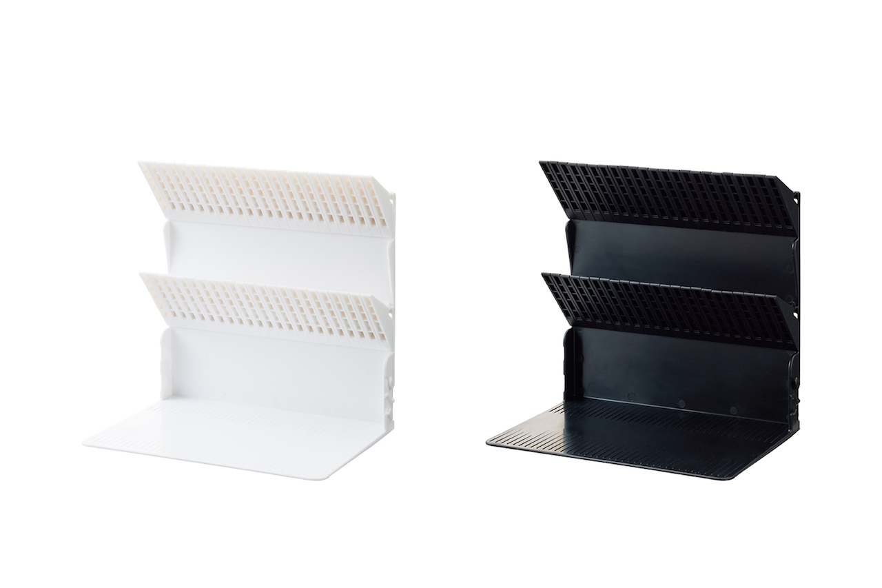 1冊でも倒れないブックスタンドは2022年10月の発売以来、少ない収納物を簡単に自立させることのできる機能性に大好評を得ている。その中で『絵本や雑誌なども収納したい』『デスク上でファイルを立てて使用したい』などの要望が届いた。そこで、ストッパーを2段設計にすることで、A4サイズ程度を収納可能となった新サイズを追加する。