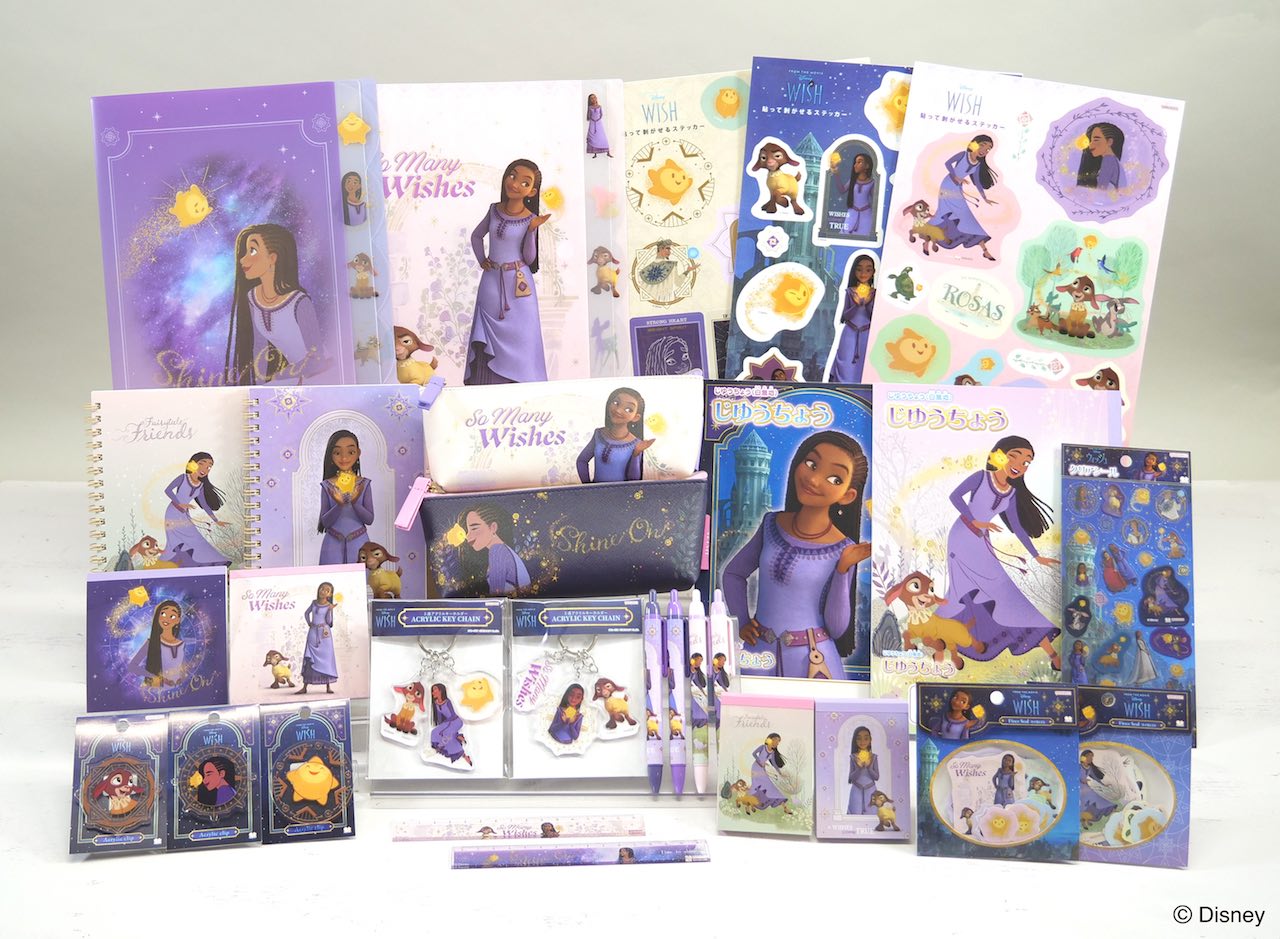 『ウィッシュ』文具・雑貨シリーズは全14種類。スクエアメモ、メモミニ、WリングノートB6、B5じゆうちょう、シャープペン、ボールペン、15cm定規、ダイカットクリアファイル5P、ペンケースS、ピースシール、クリアシール、貼って剥がせるステッカー、アクリルクリップ、3連アクリルキーホルダーがラインナップしている。