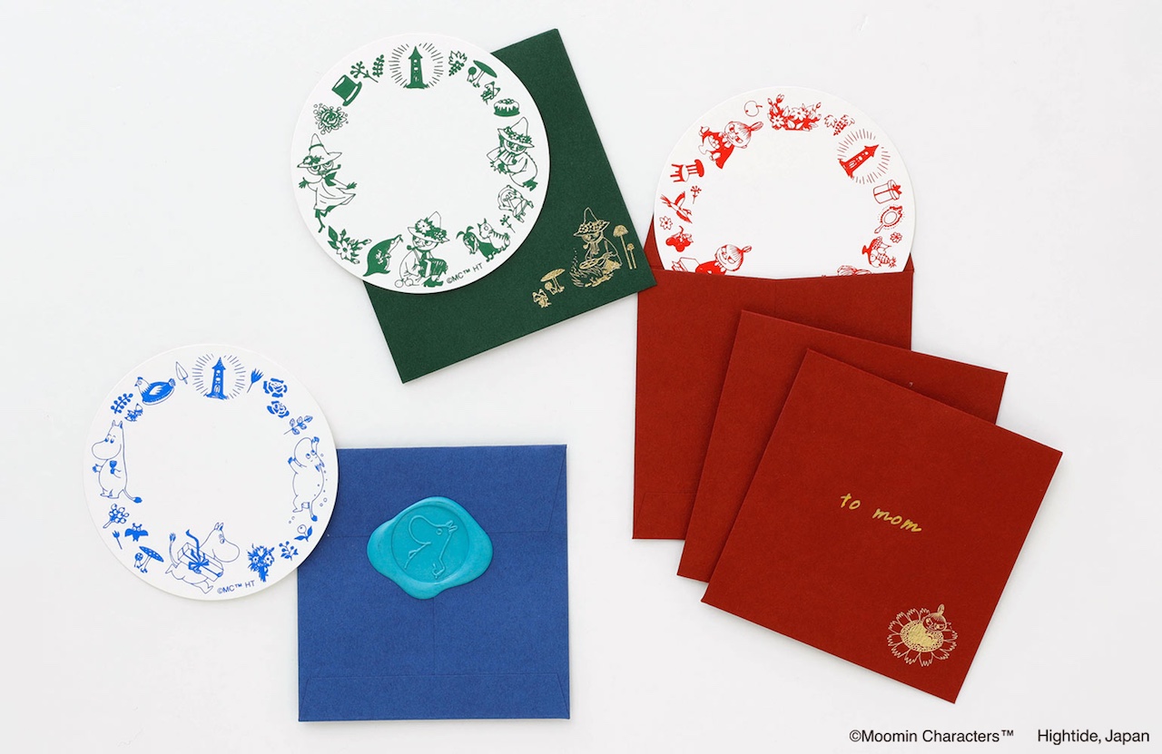 レッドにはリトルミイ、ブルーはムーミントロール、グリーンにはスナフキン。それぞれのイメージカラーに合ったキャラクターをデザイン。カードと封筒は各3枚ずつセットになっている。
