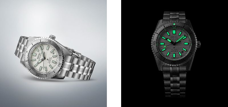 セイコーのダイバーズウオッチで初めてシースルーバック仕様とすることで、精巧に仕上げられた機械式ムーブメントの力強い動きを眺め、楽しむことができる。今回、新たに開発したブレスレットは、こまの一つひとつの両面を曲面とすることで、肌あたりが良く、しなやかで心地よい装着感を提供する。