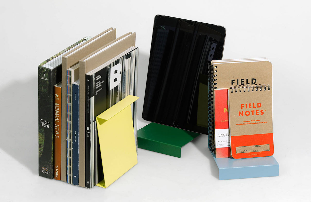 置き方や向きによって2通りの使い方ができる「ブック&ディスプレイスタンド」は本を支えるブックエンド、本やレコードなどを飾っておくディスプレイスタンドとして使用できる。