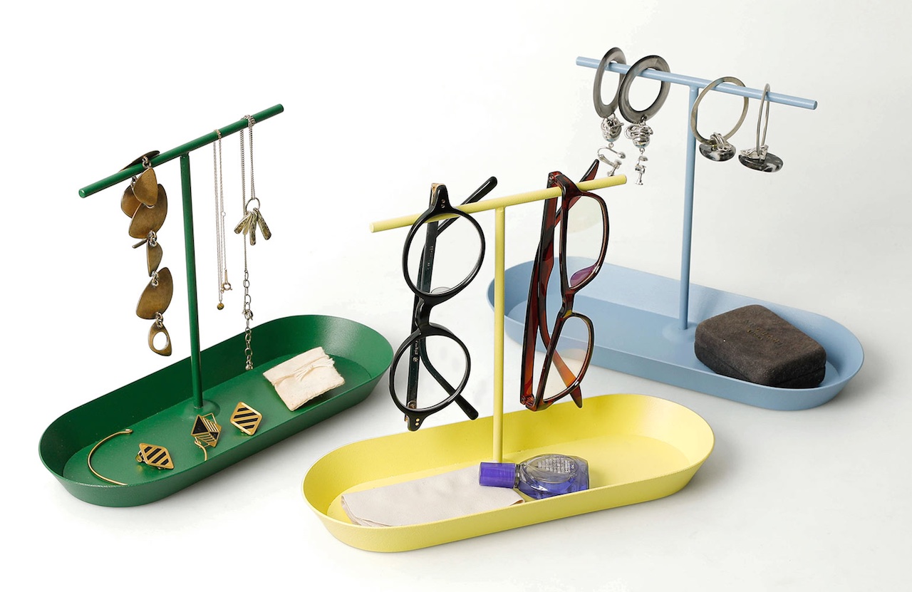 「アクセサリートレイ」はメガネやアクセサリー類を掛けられるスタンドと、小物を収納するトレイが一体化。トレイ部分にはクリーニングクロスやリングを置いたりと、便利にご使用いただけます。見せる収納としてインテリアの役目も果たす。