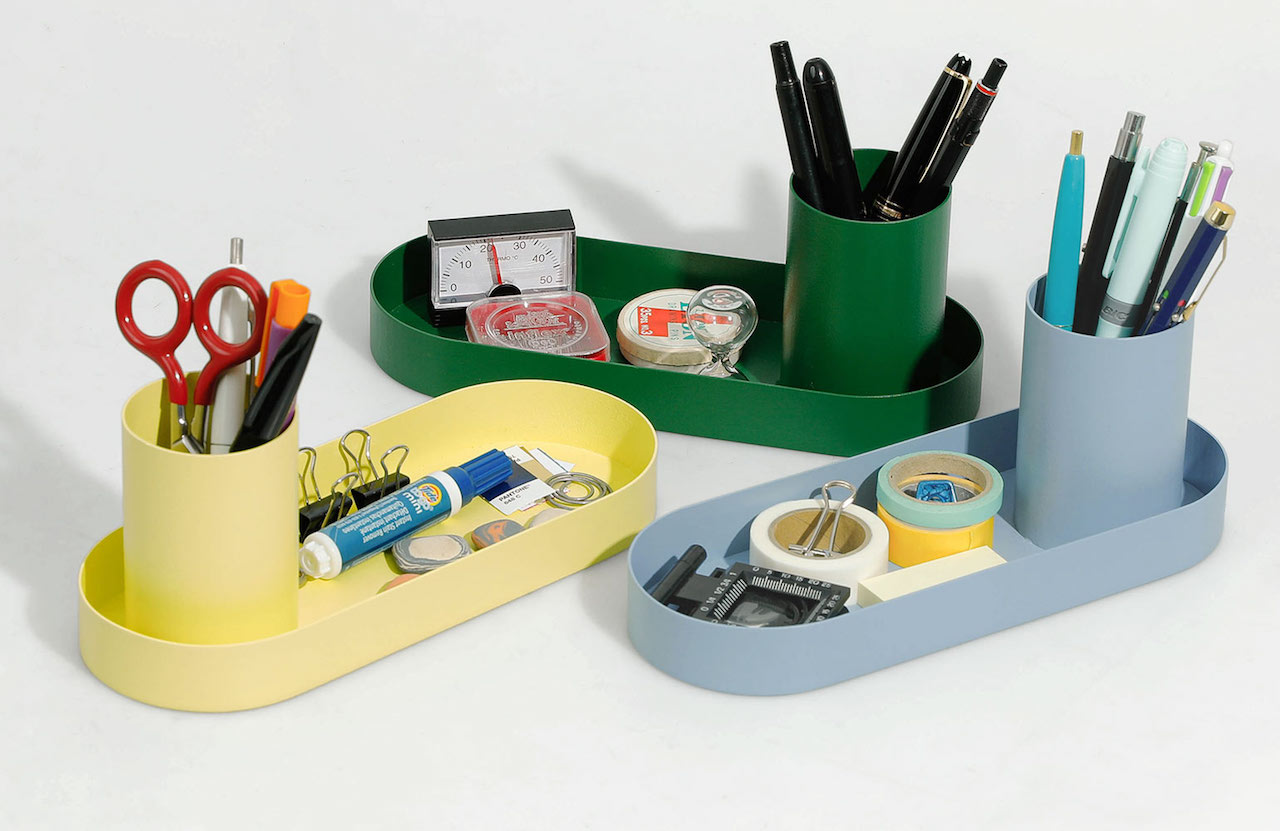 入れたものが見やすい低めのペンスタンドと、クリップや付箋といった小物を収納できるトレイがひとつになった「デスクオーガナイザー」。綺麗なカラーリングがデスク上のアクセントに。場所を取らないスリムな形状で、デスク周りのこまごましたアイテムをスマートに収納する。