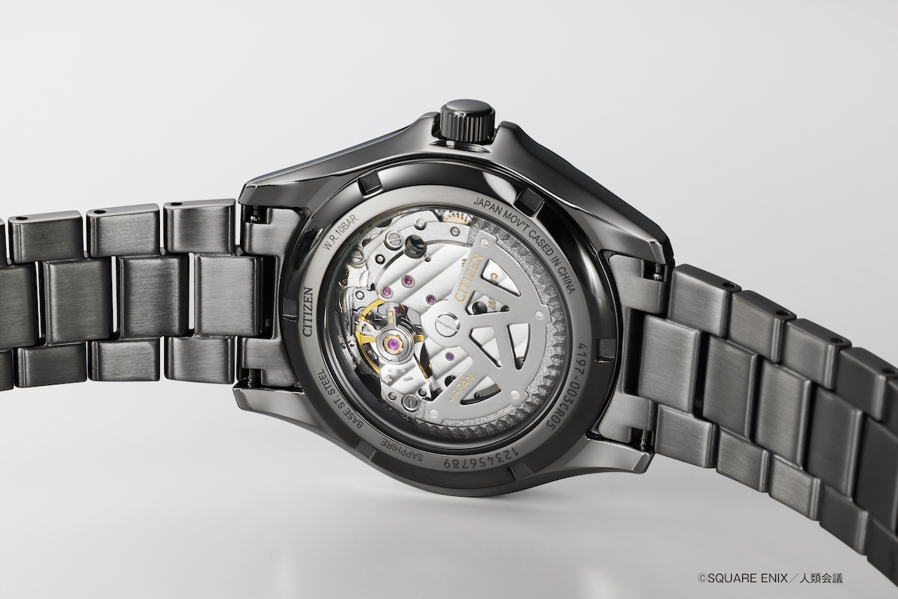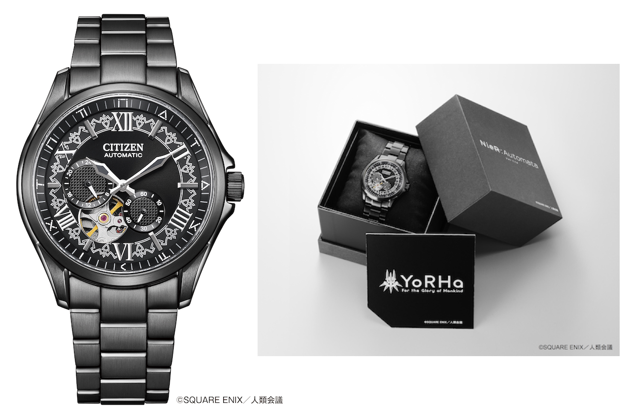 また文字板周囲には天使文字で「CITIZEN WATCH」と表記、裏面はシースルーバック仕様で 機械式ムーブメントを見られる仕様にし、世界観をより演出。ベルト部分にはヨルハエンブレムを刻印し、重厚感のあるデザインにより作品色をプラスした。限定BOXはシックな黑を基調とし、内部のカードにはヨルハエンブレムを採用している。