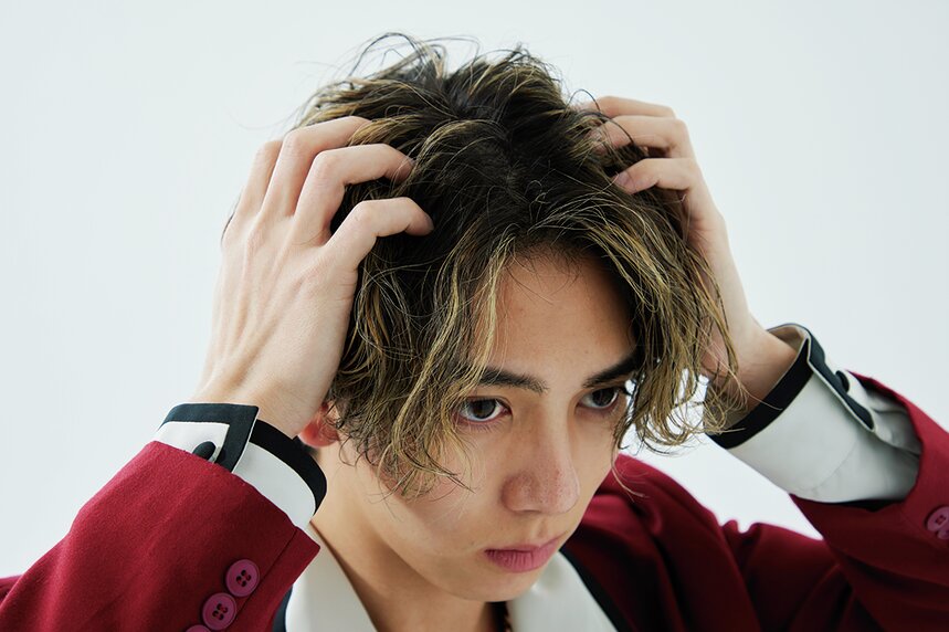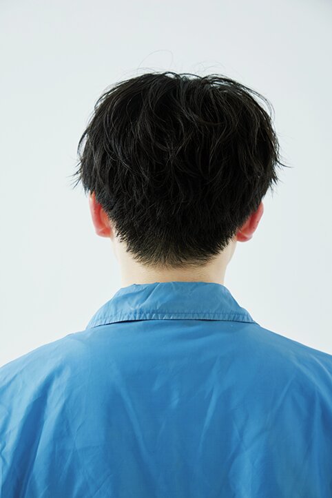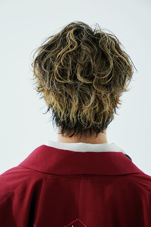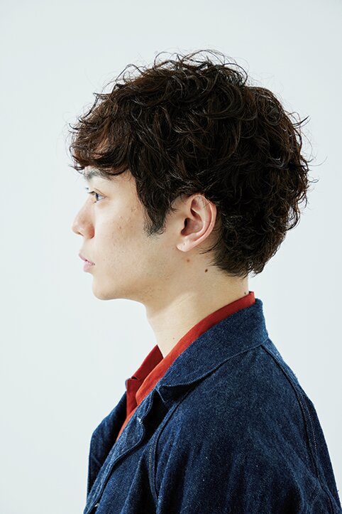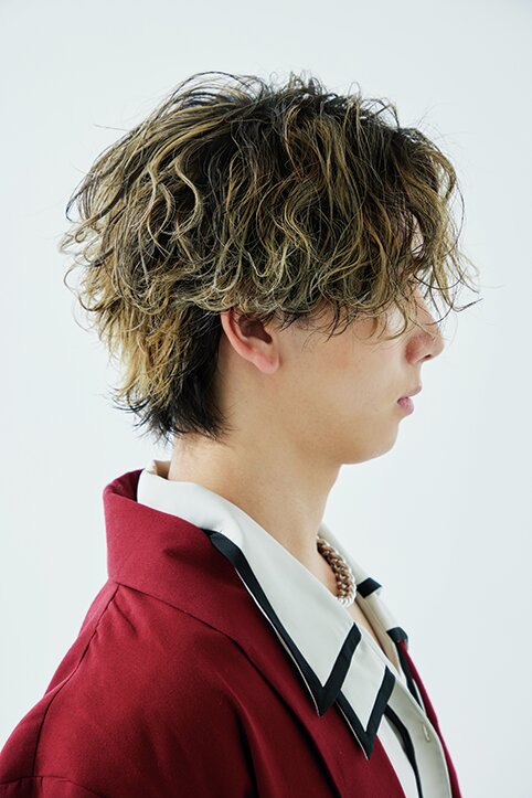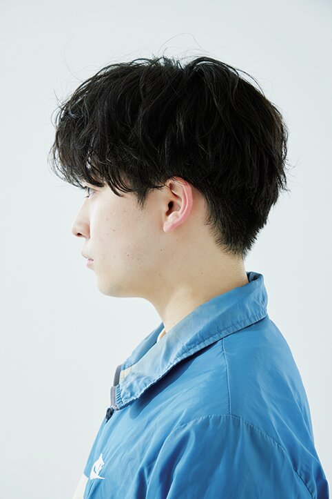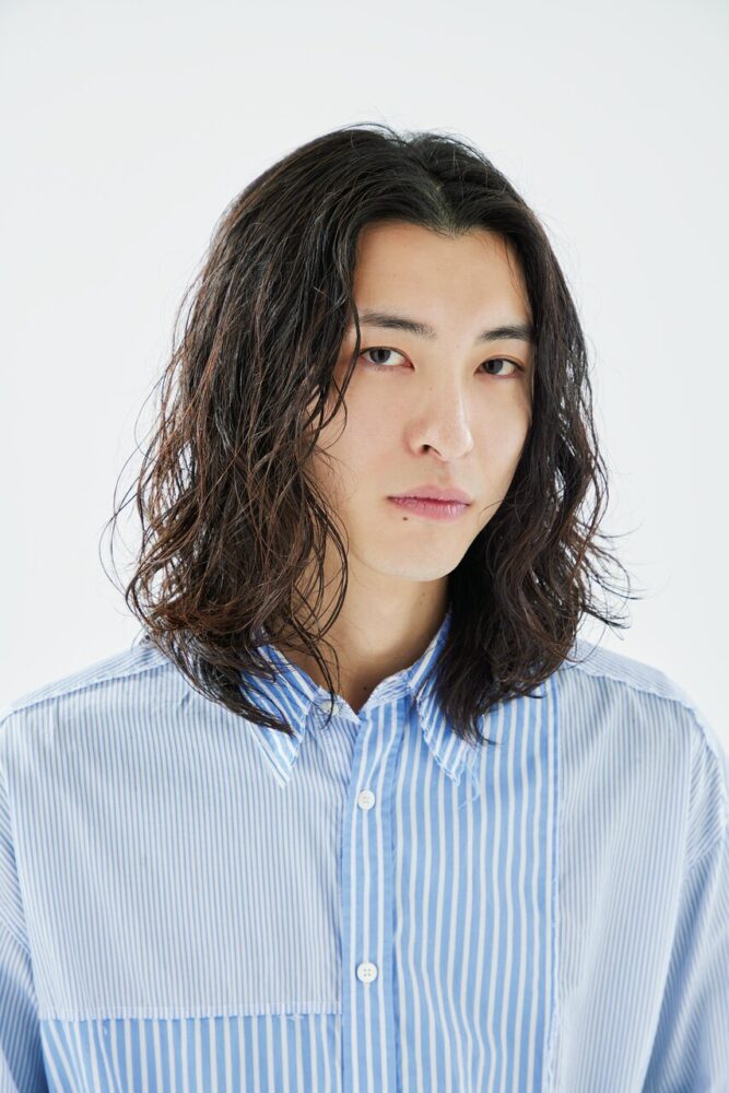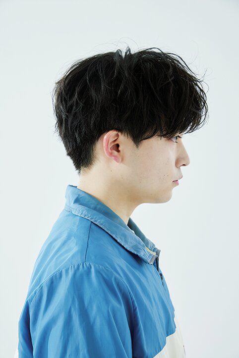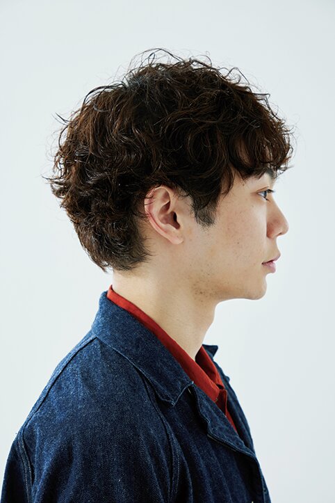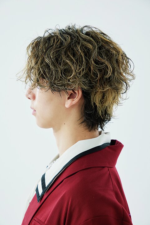 カット/レイヤーを入れすぎないマッシュベース。伸びてきたツーブロックは刈上げず、長めで整える。前髪は分け目の内側を少し短くカット。カラー/なし。パーマ/サイドバングはピンパーマでゆるくなじむ程度に。表面は17㎜のロッドでゆるめのスパイラルを。サイドは15㎜のロッドで逆巻きにする。