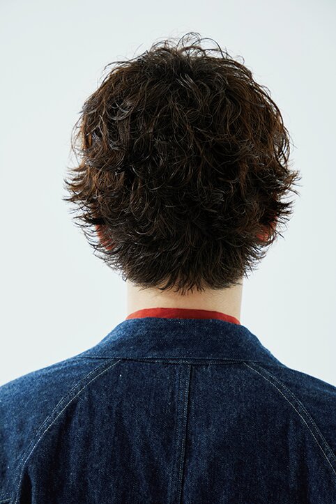 カット/えり足を残したマッシュベース。トップは短めに設定し、毛量は残すように調整。耳まわりはえり足を長めに残すことで、シルエットに遊びが生まれる。カラー/7レベルのブラウンベース。パーマ/9㎜〜21㎜のロッドで全体を1回転半目安に。耳上は逆巻きを入れ、もみあげはピンカールで流れるように。