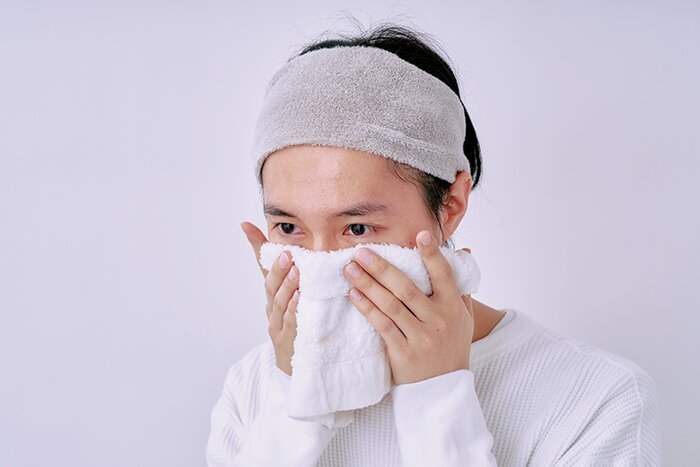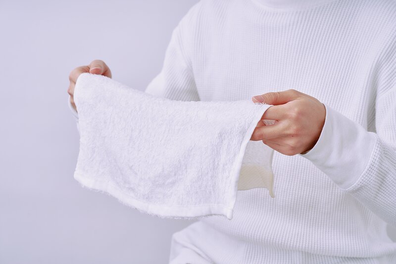意外とやりがちなのがゴシゴシ拭いてしまうこと。タオルは肌の上を横にすべらせないと肝におく。上から軽く押し当てて水けをタオルに吸い取らせよう。