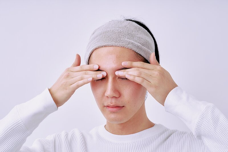 女性よりも骨格がしっかりしていて凹凸のあるメンズの顔立ち。凹んでいる部分は指で押し当てて浸透を促す。乾燥が気になるときは“追い化粧水”をしても◎。