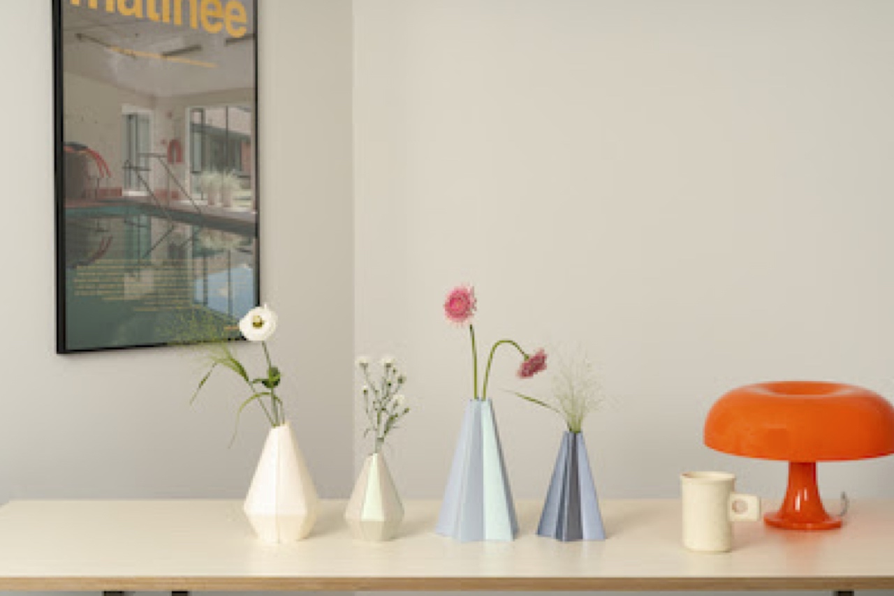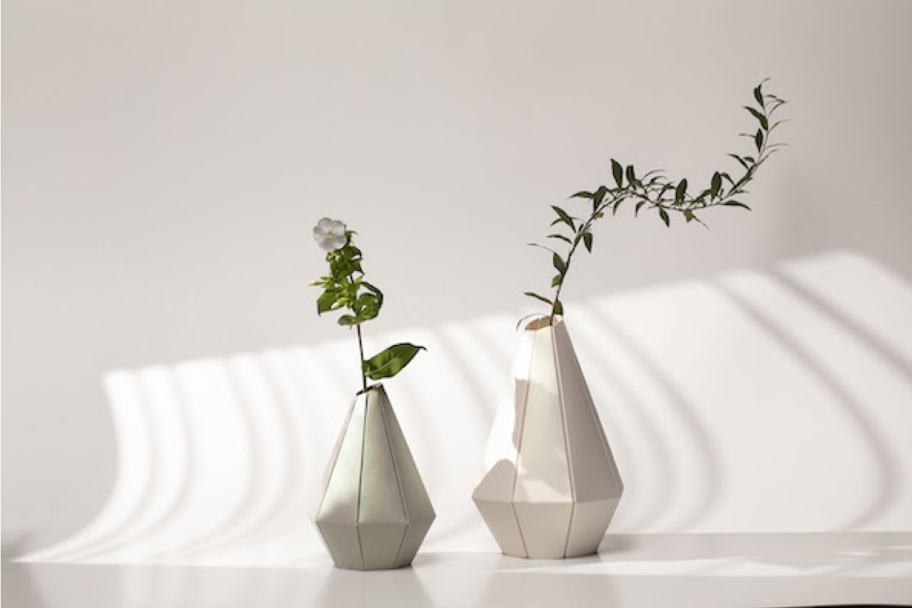 簡単な組み立てで作ることができるDIYの花瓶。二つのサイズで多様な演出が可能。一輪の花にも特別に演出することができ、空間も美しくしてくれる。グローサリーグレイ(S)&グローサリーバニラ(L)の1セット。