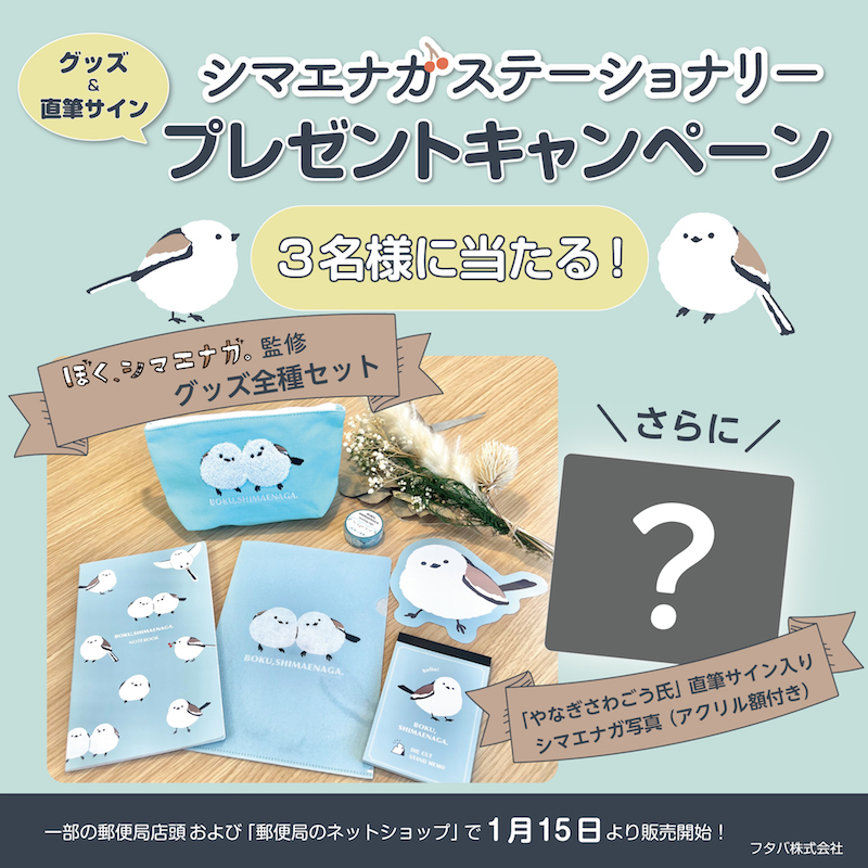 新たに描きおろされた愛らしいシマエナガイラストをふんだんに使用した可愛すぎるアイテム! さらに今回、販売記念キャンペーンを実施! シマエナガを撮り続ける写真家「やなぎさわごう」氏の直筆サイン入り写真(アクリル額付き)と今回のグッズ全種セットが抽選で3名様に当たる。(写真は3名様すべて違うものになります。どれが当たるかはお楽しみ!)