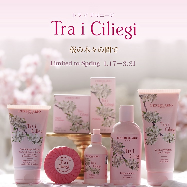 「Tra i Ciliegi(トラ イ チリエージ)コレクション」とは、厳しい冬を耐えた後あでやかに咲き誇り、美しい姿のまま散っていく桜。その唯一無二の魅力を、儚げなフローラルノートとジューシーなチェリーの香りに託し、雲のようにふんわりと香り立つ<桜とチェリーの香り>の「トラ イ チリエージ」コレクションが完成した。