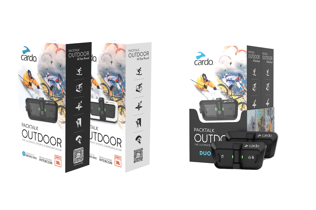 「PACKTALK OUTDOOR パックトーク アウトドア」は、種類を問わず様々なスポーツで使える、新しいコミュニケーションツール。カルドがバイク用Bluetoothインカムの分野で培った最新技術を搭載し、これまで難しかったハンズフリーでの双方向通話を実現する。