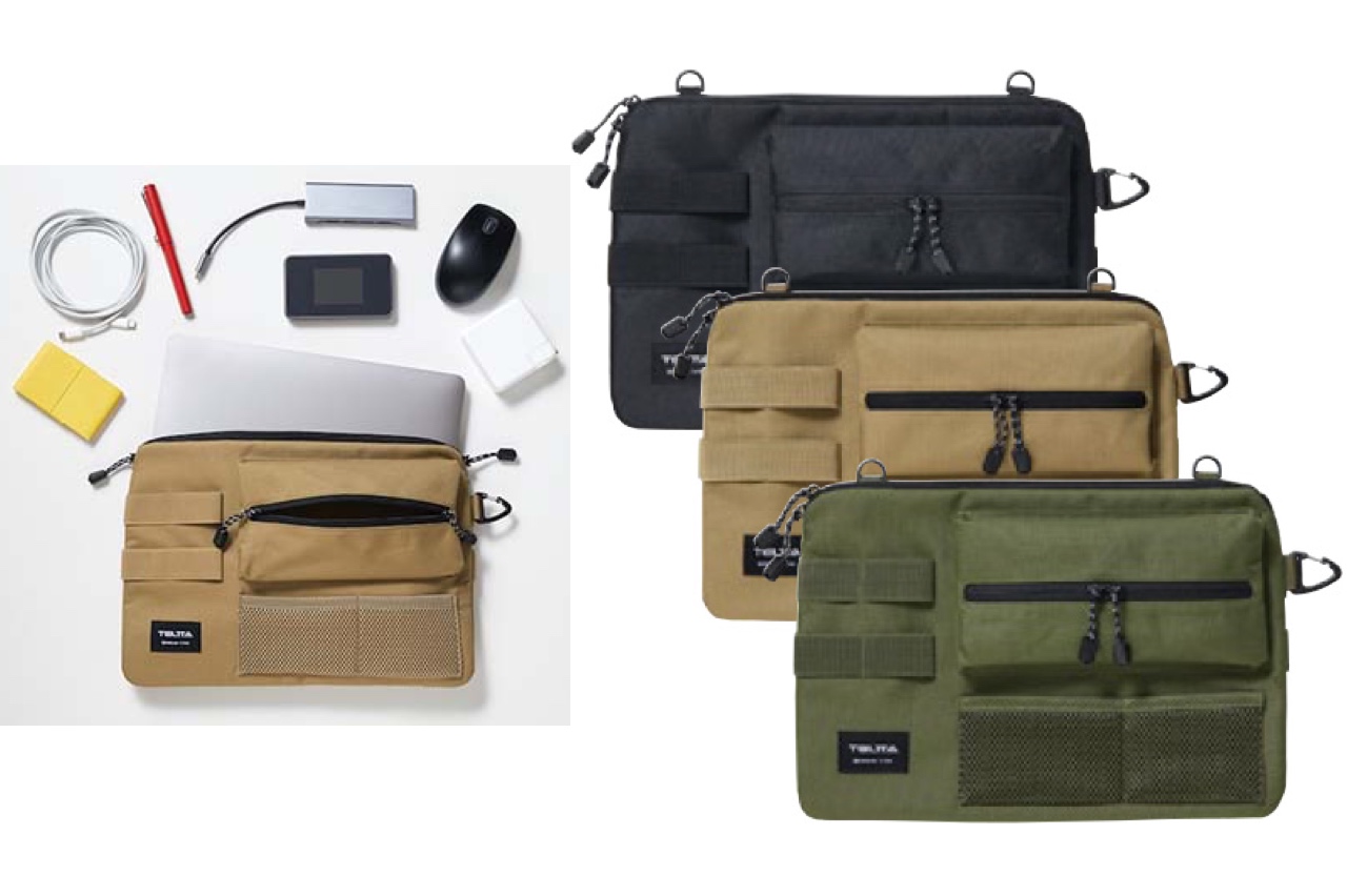 ラインアップは3種類で、コンパクトに持ち運びができ、ワークツールを吊るして整理できる「ハンギングラック」、PCや仕事道具をまとめて収納でき、本体外側に豊富なポケットがついている「マルチケース」、ペットボトルや細長い小物を収納できる「マルチポーチ」を展開する。