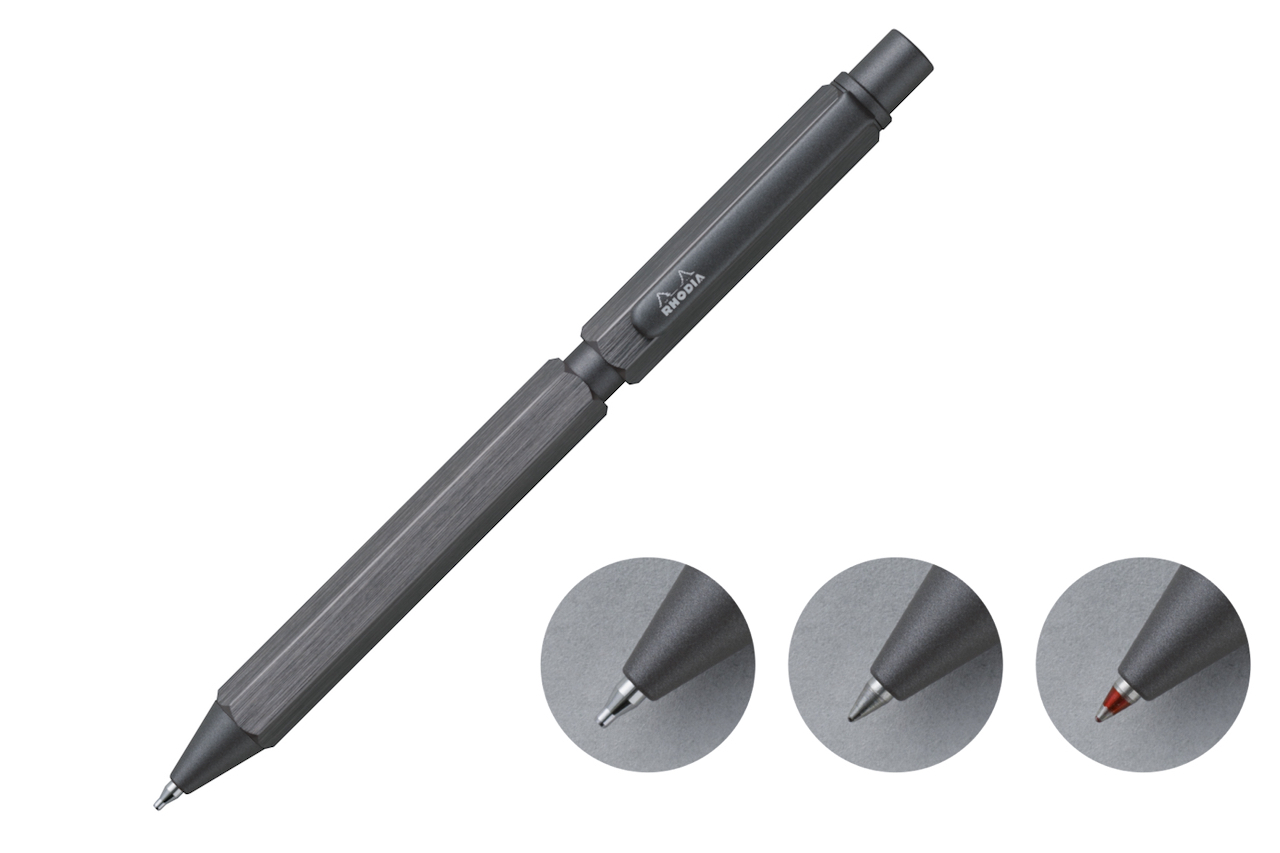 そんなロディアの筆記具コレクション「スクリプト」の多機能ペンは、ボールペン2色(ブラック・レッド)、メカニカルペンシルの3機能を搭載した3in1。シリーズ共通のヘアライン加工されたアルミニウムの六角形軸としっくり手になじむほどよい重量感で発売以来好調だ。