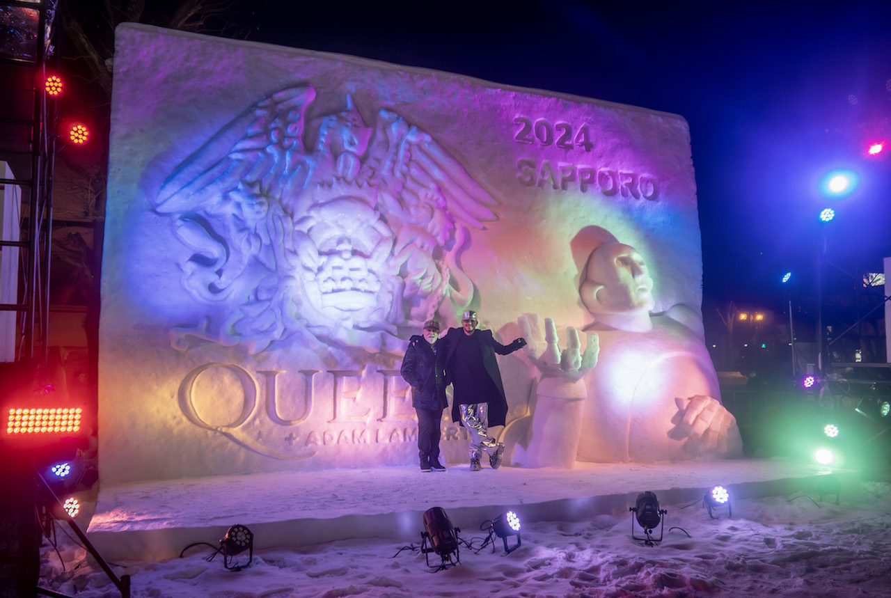 7日(水)に大阪公演を終えたクイーン+アダム・ランバートの一行は、2月8日(木)に空路で札幌入り。雪がちらつく札幌で夕食を楽しんだあと、大きな話題になっている「さっぽろ雪まつり」のクイーンの雪像の話になり、スタッフたちと「それはみんなで見に行こう」と盛り上がったロジャーとアダムが、この日の夜、お忍びで「さっぽろ雪まつり」を訪問。巨大なクイーンの雪像と対面した。